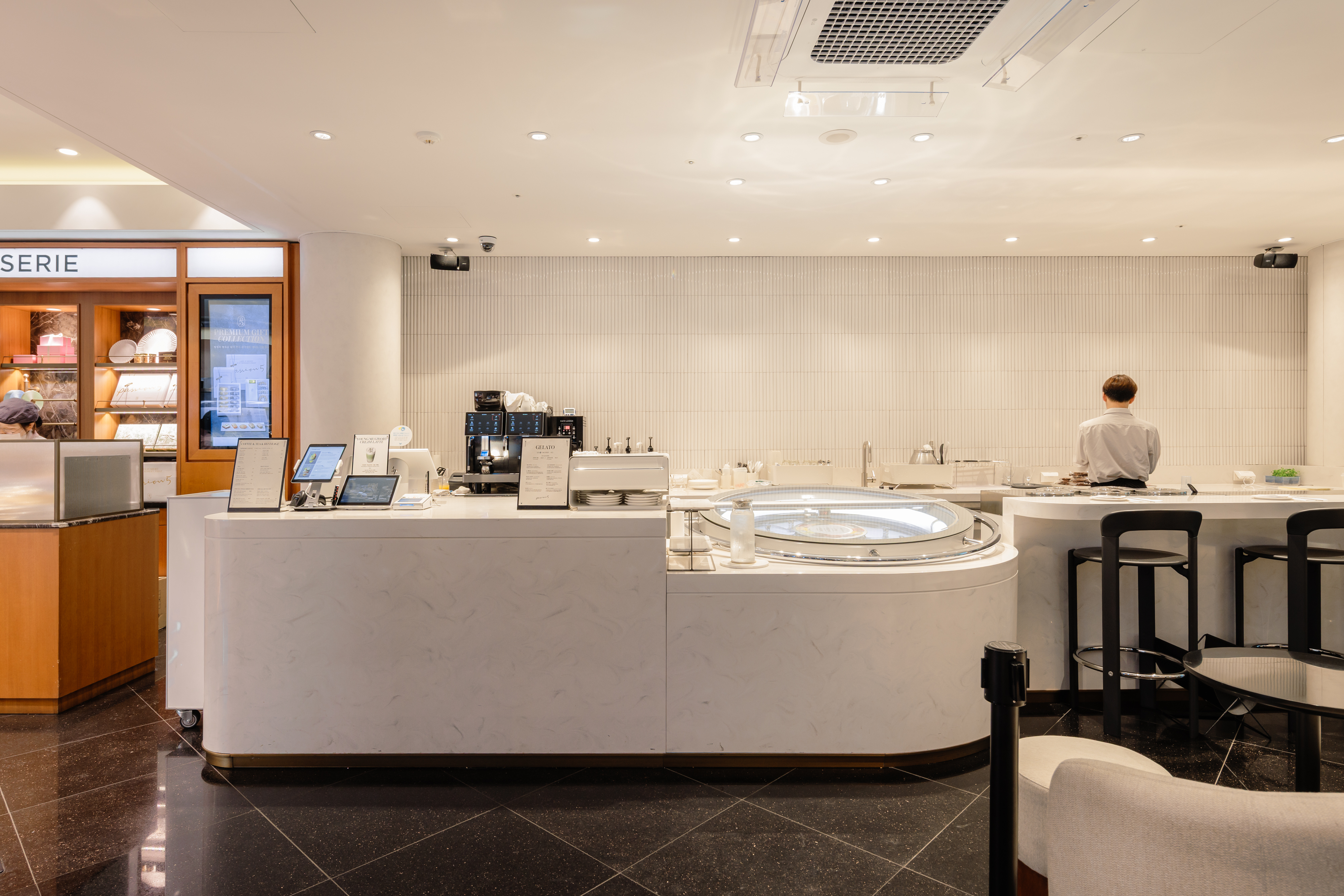 패션5 1층에 자리한 젤라또 카페는 프리미엄 젤라또와 이를 활용한 디저트를 즐길 수 있는 전용 공간입니다. 프랑스 미식 가이드 ‘라 리스트(LA LISTE)’ 수상 이력을 지닌 일본 셰프의 기술을 전수받아, 하이엔드 젤라또 디저트를 선보이고 있어요.