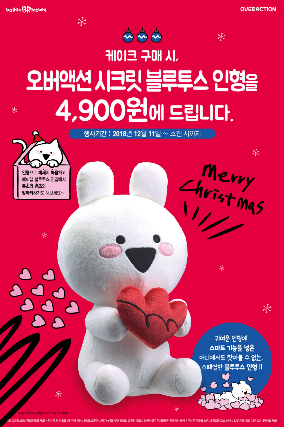 이번 프로모션은 배스킨라빈스 매장에서 크리스마스 아이스크림 케이크를 구매하면 4,900원에 ‘오버액션 시크릿 블루투스 인형’을 증정하는 행사다. ‘오버액션 시크릿 블루투스 인형’은 인기 캐릭터 오버액션토끼의 새하얀 털과 쫑긋 솟은 귀, 빨간 하트 모형이 포인트로 더해진 사랑스러운 디자인이다. 블루투스를 통해 녹음이 가능한 스마트 인형으로, 목소리를 담아 소중한 사람에게 마음을 전하기 좋다.