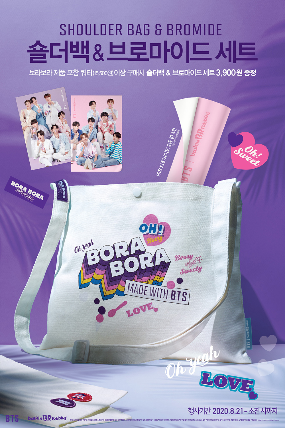 배스킨라빈스가 선보이는 ‘숄더백’은 어깨에 편하게 멜 수 있는 캔버스 소재의 가방이다. 숄더백 앞면은 배스킨라빈스의 8월 이달의 맛 ‘보라보라’를 활용한 그래픽 아트가 그려져 있고, 뒷면에는 방탄소년단과 배스킨라빈스의 로고를 나란히 넣었다. 브로마이드는 분홍색과 보라색 두 가지 종류로 제작되었으며, 배스킨라빈스 핑크 스푼을 들고 상큼한 미소를 뽐내는 방탄소년단의 모습을 담았다.