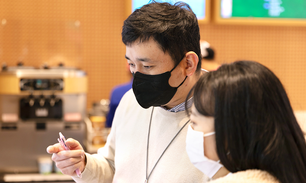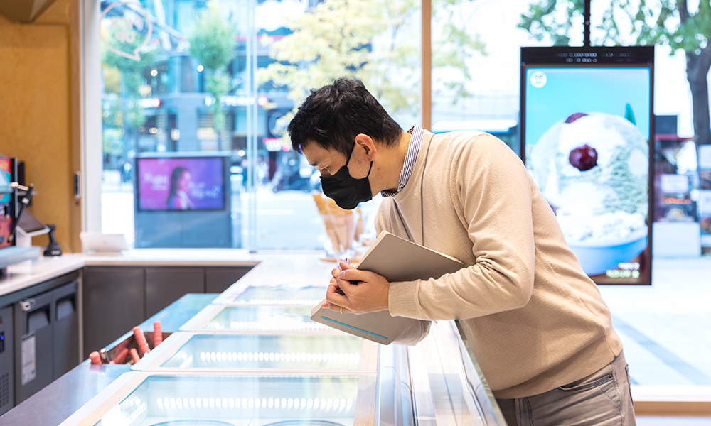 배스킨라빈스 매장에서 제품을 살펴보고 있는 김준 차장