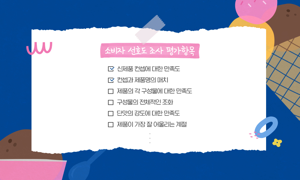 한 달에 1~2회씩 약 70명의 소비자 평가단을 모십니다. 아이스크림뿐만 아니라, 음료와 디저트까지 많게는 10여개의 시제품에 대한 평가를 진행하는데요. 각 제품의 컨셉에 대해 자세히 설명을 드린 뒤 시식회를 갖고 평가서를 받습니다. 평가 항목은 무척 다양한데요. 컨셉에 대한 만족도, 제품의 각 구성물에 대한 만족도, 단맛의 강도에 대한 만족도, 제품이 가장 잘 어울리는 계절 등 다각적인 측면에서 의견을 듣습니다. 얼마나 세부적인 평가를 진행하는지 예를 들어드리자면, 망고 아이스크림을 개발한다고 했을 때 여러 품종의 망고로 시제품을 만들어 각각 시식해보고 만족도 조사를 실시합니다. 전 세계에서 재배되는 망고 품종만 해도 수백 가지가 넘고 제각기 다른 맛을 내니까요.