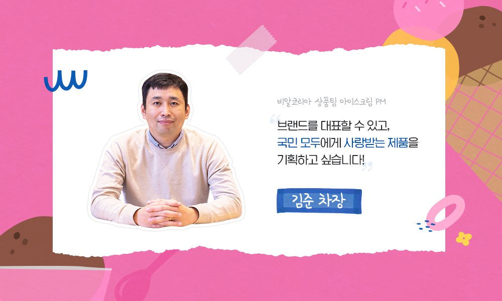 안녕하세요. 비알코리아 배스킨라빈스 상품팀의 김준 차장입니다. 지난 2008년 7월에 입사해 올해로 13년째 배스킨라빈스에서 근무하고 있습니다. 현재 아이스크림 PM(Product Manager)으로써 신제품 아이스크림을 기획하고 출시하며, 연간 아이스크림 출시 플랜을 관리하는 업무를 맡고 있습니다.
