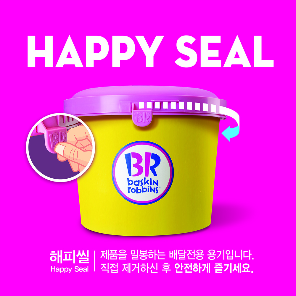 배스킨라빈스의 ‘해피씰’은 제품 리드(뚜껑)와 결합된 동그란 결합링으로, 제품을 완전하게 밀봉할 수 있는 배달 전용 패키지다. 배달 과정에서 외부와의 접촉을 완전히 차단할 수 있다. 고객은 결합링에 달린 손잡이를 잡은 뒤 제품 테두리를 따라 서서히 당겨 해피씰을 제거하면 된다.