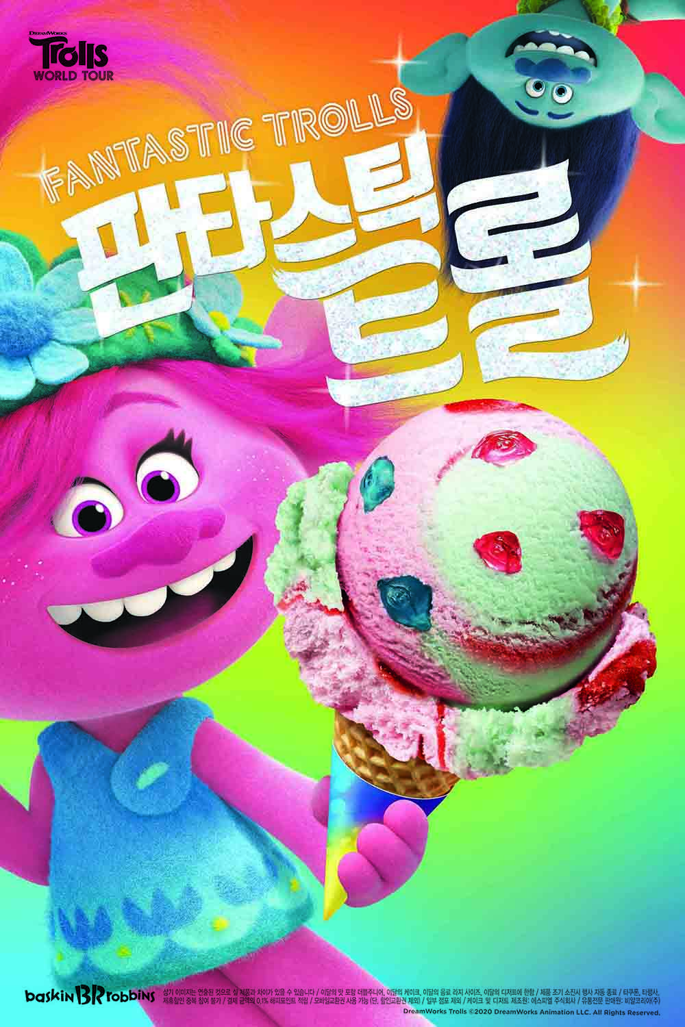 배스킨라빈스의 ‘판타스틱 트롤’은 영화 ‘트롤’ 속 주인공 ‘파피’와 ‘브랜치’ 캐릭터를 활용한 아이스크림 신제품이다. 분홍색 ‘체리 아이스크림’과 파란색 ‘키위 샤베트’ 두 가지 플레이버로 구성됐으며, 알록달록한 트롤 캐릭터 모양 젤리가 콕콕 박혀있다. 상큼하고 풍성한 과일 맛과 젤리의 쫄깃한 식감, 스트로베리 리본의 달콤한 맛이 어우러진 것이 특징이다.