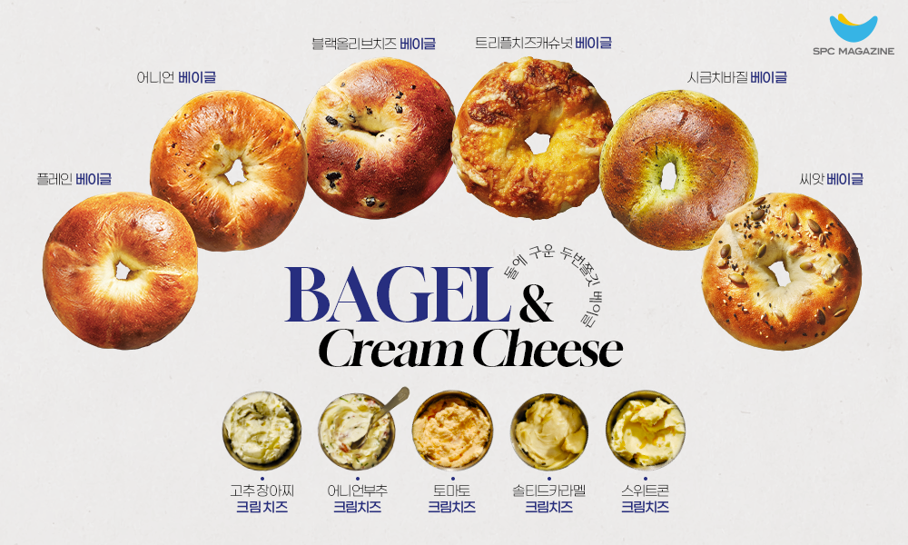 ‘돌에 구운 두번쫄깃 베이글’은 총 6종류의 베이글과 5가지의 크림치즈를 함께 즐길 수 있습니다. 베이글은 클래식한 맛을 느낄 수 있는 ‘플레인 베이글’부터 블랙 올리브와 롤치즈가 들어간 짭조름한 맛의 ‘블랙올리브치즈 베이글’, 3가지 치즈와 캐슈넛이 들어가 고소한 ‘트리플치즈캐슈넛 베이글’, 양파와 고추, 베이컨칩이 함유돼 한국적인 맛을 자랑하는 ‘어니언 베이글’, 시금치와 생바질을 듬뿍 넣어 향긋한 풍미가 매력적인 ‘시금치바질 베이글’, 해바라기씨와 호박씨, 검은깨, 참깨가 토핑돼 건강한 맛의 ‘씨앗 베이글’까지 총 6가지의 독창적인 맛과 식감을 즐길 수 있습니다.