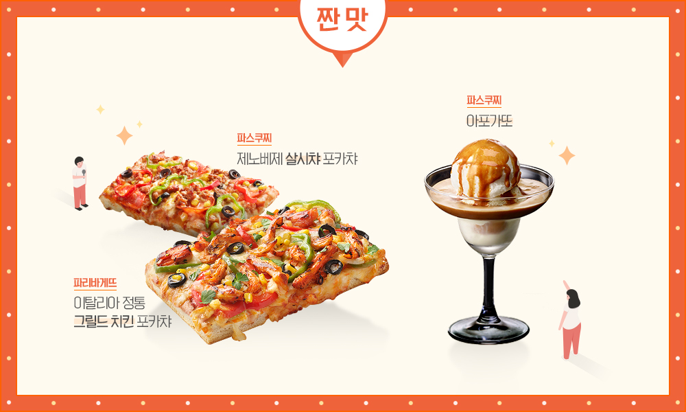 짠맛을 선택하셨나요? 일반적으로 간이 잘 된 음식은 입맛을 더 끌어올 수 있습니다. 파스쿠찌에서는 이탈리아의 생 햄 살시챠와 페퍼로니가 어우러져 중독성 있는 맛을 내는 ‘제노베제 살시챠 포카챠’를 만나보실 수 있습니다. 짭짤한 햄이 입맛을 돋우고 든든한 한 끼 식사로도 좋은 메뉴인데요. 천일염으로 만든 젤라또에 에스프레소를 가미한 파스쿠찌의 ‘오리지날 아포가또’와 함께 즐기실 것을 추천해드립니다.