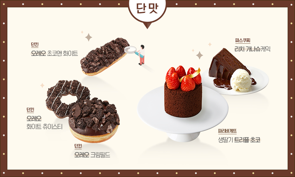 던킨에서는 오레오 초코 쿠키를 활용한 제품들을 판매하고 있습니다. 화이트 크림 필드 도넛 위에 오레오 쿠키를 얹어 풍성한 식감을 완성한 ‘오레오 크림 필드’, 바삭한 오레오 쿠키와 쫄깃한 츄이스티의 식감을 한 번에 즐길 수 있는 ‘오레오 화이트 츄이스티’, 초코와 화이트 필링을 가득 넣은 듀얼 필링 도넛에 오레오 쿠키를 얹은 ‘오레오 초코앤화이트’는 오레오 쿠키의 바삭바삭한 식감은 살리고 도넛의 쫄깃하고 부드러운 크림과의 꿀 조합을 맛볼 수 있는 제품인데요. 던킨에서 단맛과 함께 다양한 식감이 주는 먹는 재미도 함께 느껴보세요.