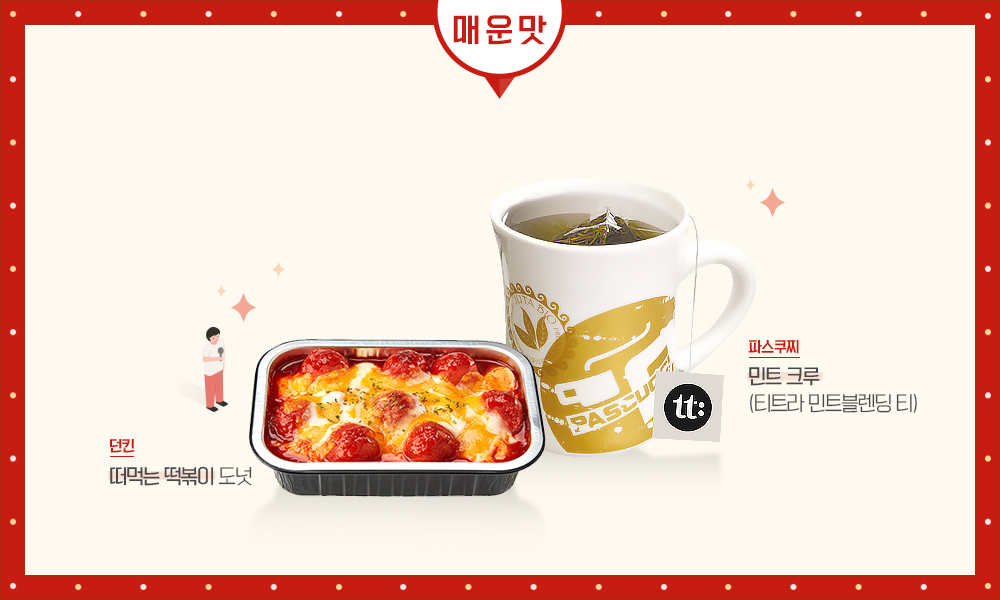 매콤한 맛을 선택하셨나요? 던킨은 매콤한 떡볶이 소스와 쫄깃한 먼치킨 도넛을 조합한 색다른 메뉴를 선보였습니다. 죠스푸드의 떡볶이 브랜드 ‘죠스떡볶이’와의 이색 컬래버레이션을 통해 ‘떠먹는 떡볶이 도넛’을 출시한 것인데요. 쫀득쫀득한 먼치킨을 떡볶이에 들어간 떡으로 재해석해 매콤한 떡볶이 소스와 고소한 치즈를 얹어 색다른 맛과 식감을 제공하고 있습니다. 마치 떡볶이에 먼치킨이 빠진 것 같은 독특한 비주얼과 조합으로 많은 떡볶이 마니아들의 마음을 사로잡고 있는데요. 던킨의 매콤한 개성이 담긴 떠먹는 떡볶이 도넛과 함께 색다른 경험을 해보시길 추천해드립니다!