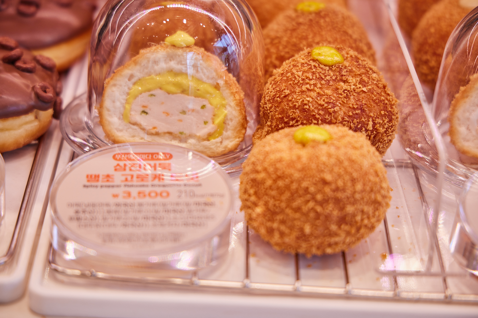 평소 매콤한 음식을 즐긴다면 ‘삼진어묵 땡초 고로케 도넛’을 추천해 드려요!🌶 어묵에 쏙쏙 박힌 땡초가 전체적인 도넛의 맛을 깔끔하게 잡아주고, 홀그레인 머스터드소스와 환상적인 궁합을 자랑합니다. 동글동글한 모양에 부담 없는 사이즈로 하나씩 맛보아도 좋아요.🤗