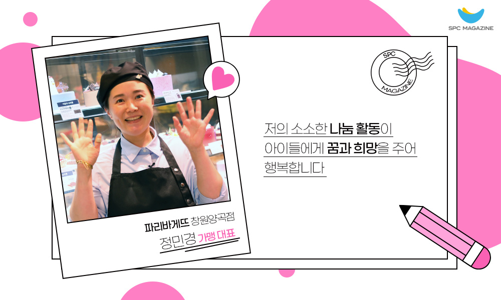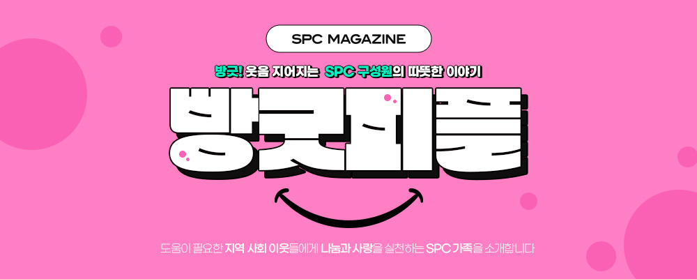 SPC는 “나눔은 기업의 사명”이라는 경영 철학 아래 다양한 사회공헌활동을 펼치고 있습니다. 특히 소비자와 직접 만나는 전국 6,600여 개 점포에서도 자발적인 나눔과 기부 활동으로 이웃 사랑을 실천하고 있는데요. SPC매거진은 #빵굿피플 (방긋 웃음 지어지는 SPC 가족 이야기)을 통해 따뜻한 마음으로 주변의 어려운 이웃들을 돕고, 나눔의 가치를 실천하는 가맹대표와 아르바이트 근무자, 임직원 등 SPC 가족의 이야기를 전하고자 합니다. 훈훈한 이야기로 우리에게 감동을 선사할 #빵굿피플의 네 번째 주인공을 만나보세요.