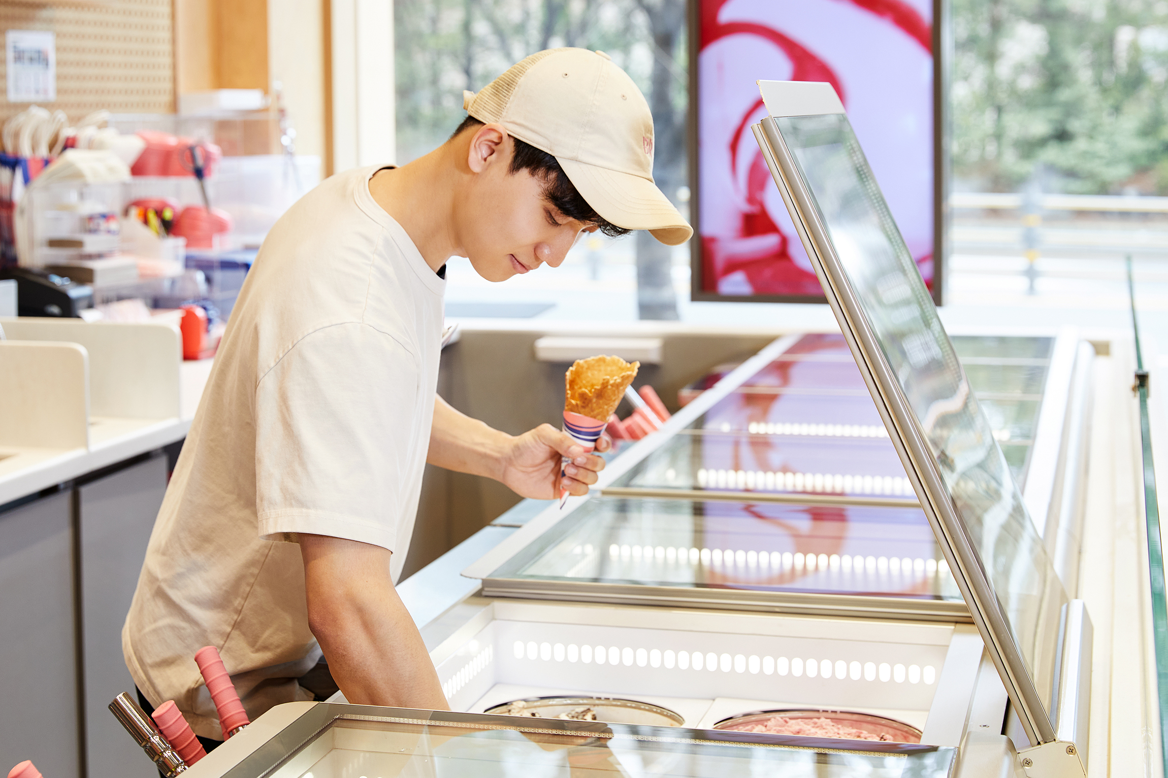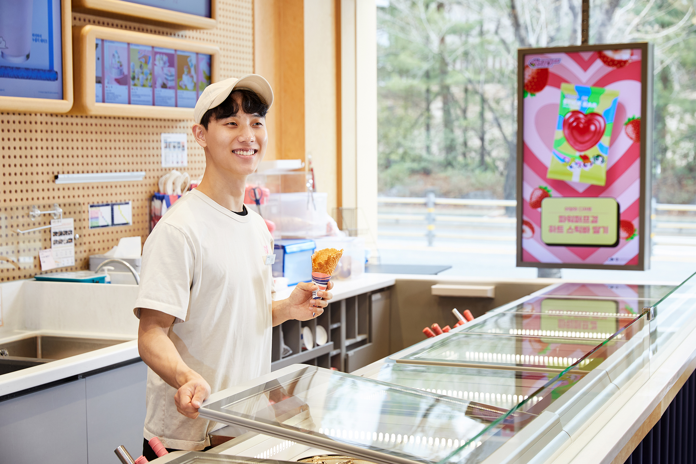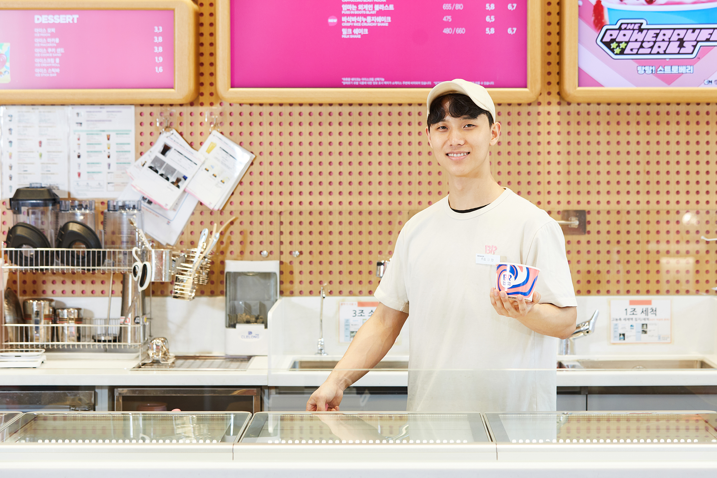 안녕하세요. 저는 현재 배스킨라빈스 동탄푸른마을점에서 매니저로 근무하고 있는 김경민입니다. 매장 운영 지원 및 재고 관리, 교육 등 전반적인 업무를 담당하고 있습니다. 어릴 적부터 아이스크림을 워낙 좋아했기도 하고요. (웃음) 특별한 날 부모님께서 아이스크림 케이크를 사주시는 날이면 큰 선물을 받은 듯 기뻤습니다. 이 기쁨을 저도 다른 사람들에게 나눠주고 싶다고 생각해서 배스킨라빈스에 지원하게 됐어요.