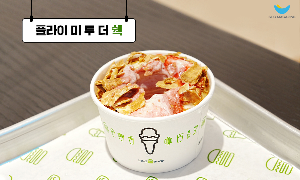 바닐라 커스터드에 달콤한 스트로베리 퓨레와 바삭한 슈가 콘의 조화가 매력적인 ‘플라이 미 투 더 쉑’