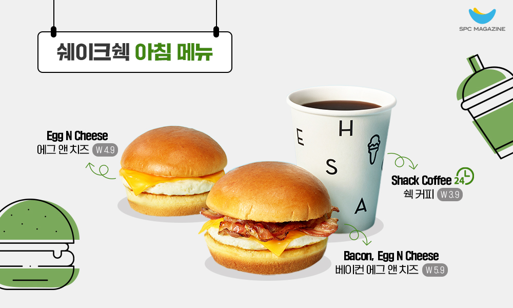 에그 앤 치즈는 부드러운 계란 프라이 위에 고소한 치즈가 토핑되어 아침에 가볍게 즐기기 좋고, 베이컨 에그 앤 치즈는 계란 프라이 위에 애플우드 칩으로 훈연한 베이컨과 치즈가 어우러져 밸런스 잡힌 한 끼 식사로 부족함이 없습니다. 여기에 국내 일부 점포에서만 판매되는 쉑 블렌드 원두를 사용한 블랙 커피를 곁들이면 더욱 완벽한 아침 식사가 완성됩니다.