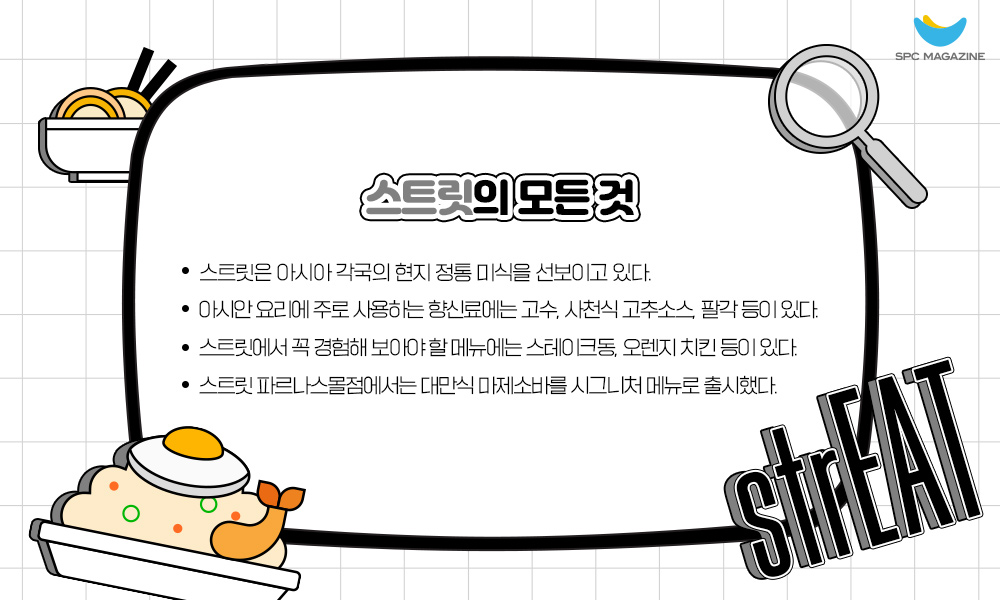 해외에서의 이국적인 먹거리는 여행의 큰 즐거움 중 하나입니다. 최근에는 한국에서도 세계 각국의 맛과 정취를 선보이는 식당들이 큰 인기를 끌고 있는데요. 그중에서도 SPC는 아시아 누들&라이스 전문점 스트릿을 통해 아시아 각 지역의 특색있는 요리를 선보이고 있습니다. 에스펀지 9화에서는 수많은 요리 중에서도 ‘스트릿이 아시안 요리를 선보이는 이유는?’을 주제로 궁금증을 풀어보는 시간을 가져봤습니다. 현지 정통 레시피를 고수하는 이유와 스트릿에서만 맛볼 수 있는 특별한 메뉴까지 지금부터 함께 만나보세요.