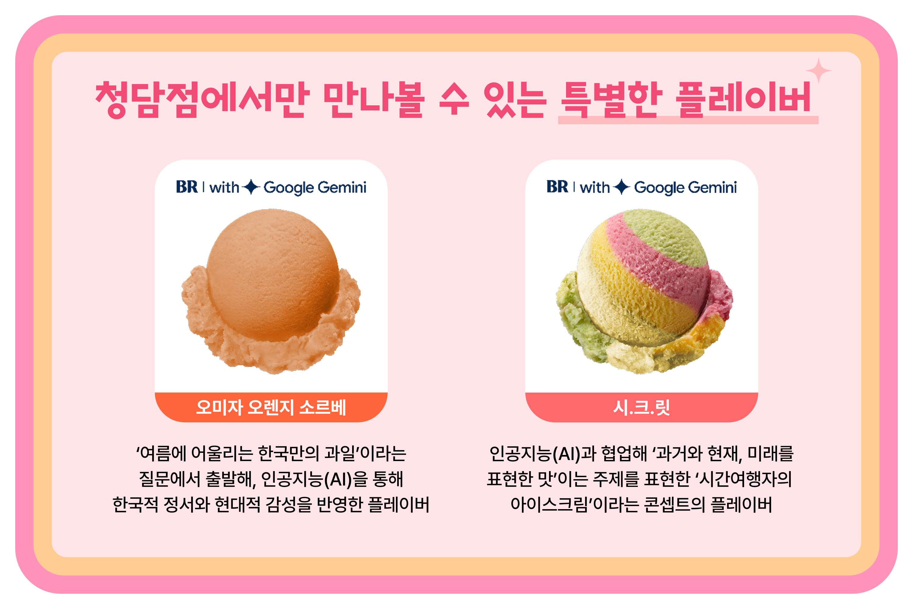 🌟 시.크.릿 : ‘과거와 현재, 미래를 표현한 맛’이라는 질문을 출발점으로, 인공지능(AI)을 통해 제안받은 열대 과일을 조합해 ‘시간여행자의 아이스크림’이라는 콘셉트로 개발된 플레이버