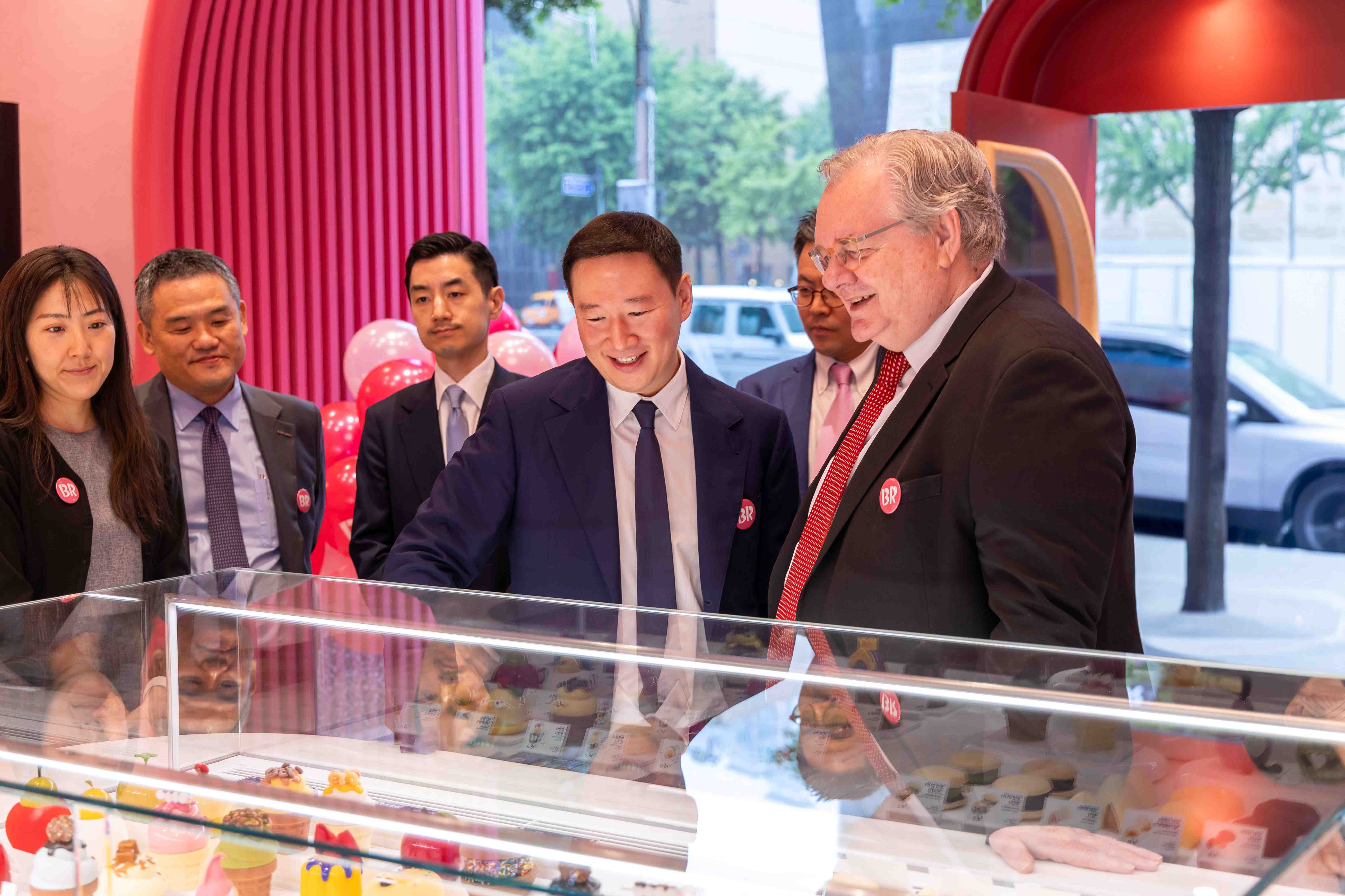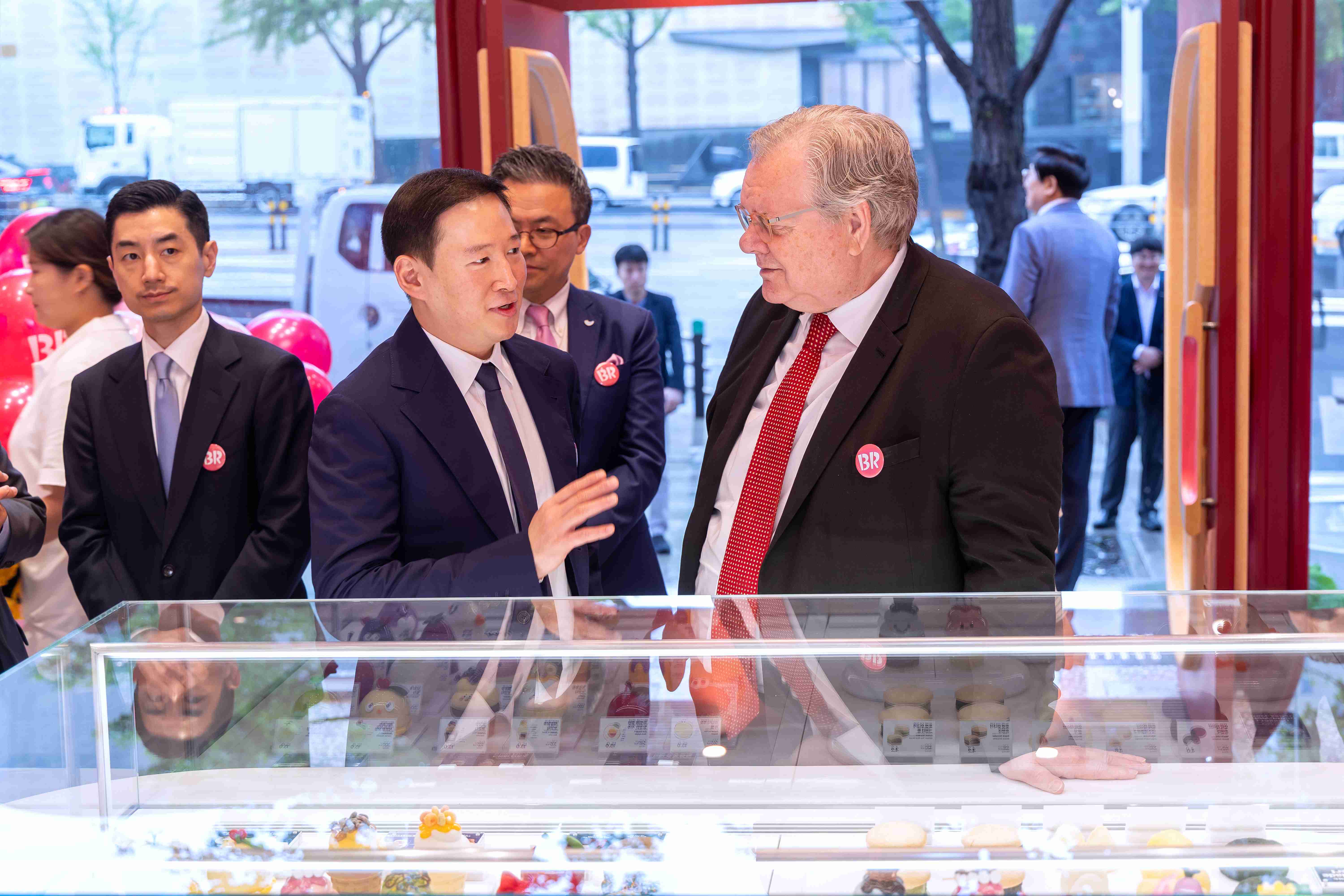 배스킨라빈스 청담점 오프닝 행사에서 허희수 SPC그룹 부사장(왼쪽)이 제프리 존스 로날드 맥도날드 하우스 회장(오른쪽)에게 쇼케이스에 진열된 청담점 특화 제품을 설명하고 있는 모습