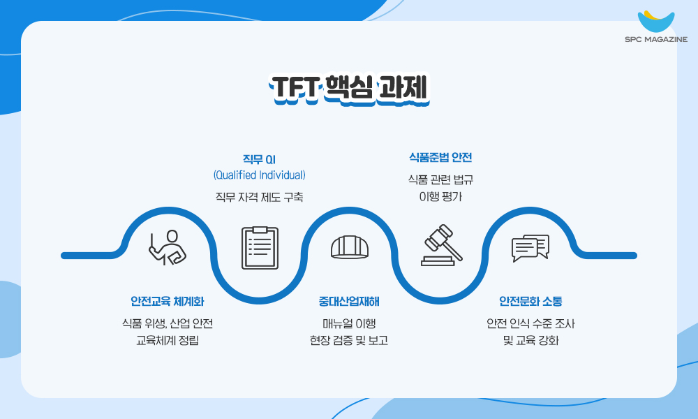 이번 안전문화 TFT 발족을 계기로 SPC그룹은 식품위생과 산업안전을 위한 튼튼한 주춧돌을 마련했습니다. 모든 임직원의 적극적인 동참이 더해져 한층 더 강력한 안전문화가 정착될 수 있기를 기대해봅니다. 직원들이 안전하게 근무할 수 있는 환경을 갖추고 위생적인 식품을 생산할 수 있도록 SPC그룹은 항상 최선을 다하겠습니다.