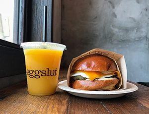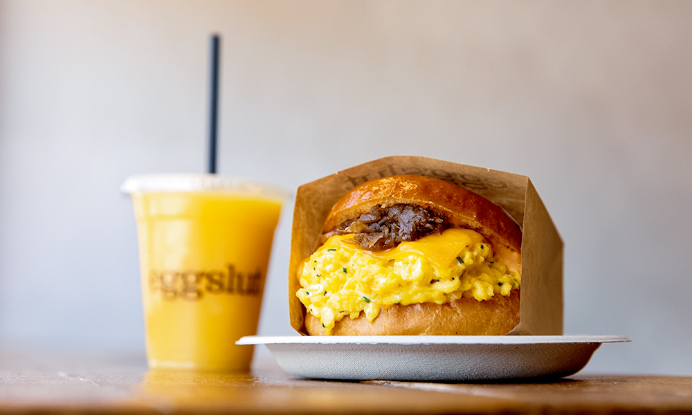 에그슬럿에서는 달걀로 요리한 다양한 음식을 맛볼 수 있는데요. ‘스크램블드에그(scrambled egg)’와 ‘커들드 에그(수란, coddled egg)’, ‘오버 미디움 에그'(흰자는 완전히 익히고, 노른자는 약간 흐르는 정도로 만든 달걀프라이, over medium egg)까지 달걀을 다양한 방식으로 요리하고, 그와 어울리는 재료들을 함께 곁들여 어떤 샌드위치를 선택해도 맛있는 달걀 요리를 맛볼 수 있도록 했습니다. 에그슬럿의 시그니처 메뉴인 ‘페어팩스(Fairfax)’의 스크램블드에그는 약한 불에 오래 젓는 프렌치 오믈렛 스타일로 조리해 먹는 내내 몽글몽글한 식감을 느낄 수 있습니다. 차이브가 들어간 스크램블드에그에 달큰한 ‘캐러멜라이즈드 어니언'(오랜 시간 가열해 풍미가 깊은 단맛을 극대화한 양파, caramelized onion)과 매콤한 ‘스리라차 마요 소스(핫소스와 마요네즈를 섞은 소스, sriracha mayo sauce)’를 얹어 부드러움과 여운이 긴 감칠맛이 조화를 이룹니다.