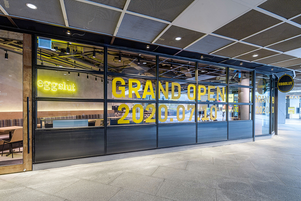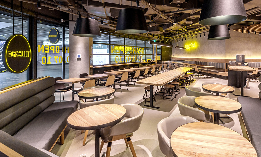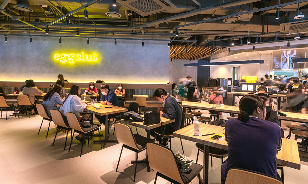 매장 내 공간은 음식과 음악, 오픈 키친을 비롯해 4면 와이드 스크린 ‘미디어 포 월(MEDIA 4 WALL)’이 설치되어 고객에게 미식뿐만 아니라 오감을 만족시킬 수 있도록 준비되었습니다. 매장 앞에는 달걀 모양의 에그슬럿 로고가 빛나는 블레이드 사인이 눈에 들어오는데요. 에그슬럿을 나타내는 노란색과 검은색을 활용해 심플하게 만들어졌지만 단순한 디자인이 주는 매력이 시선을 사로잡습니다. 매장 벽면에 장식된 에그슬럿 로고와 네온사인 역시 에그슬럿 본점 그랜드 센트럴 마켓점의 역사성을 상징적으로 보여주고 있습니다.