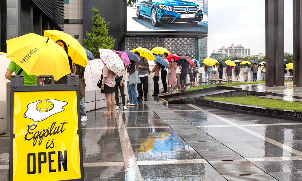 서울 지하철 2호선 삼성역 5,6번 출구와 코엑스몰을 잇는 밀레니엄 광장에 문을 연 에그슬럿 1호점 앞에는 음식을 맛보기 위해 새벽 6시부터 첫 번째 손님이 줄을 섰는데요. 에그슬럿의 오픈을 기다리는 줄은 계속 늘어나 개점 시간인 10시까지 약 300명의 손님들이 길게 줄을 서는 진풍경이 펼쳐졌습니다.