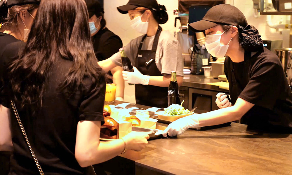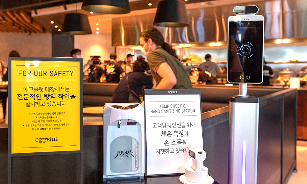 한편, 에그슬럿은 버추얼 런칭에 이어 고객의 위생 안전을 위해 다양한 준비를 했습니다. 매장에 출입하는 모든 고객들의 체온과 마스크 착용 여부를 자동하는 ‘비대면 안면인식 발열체크기’를 설치하고, 공유 테이블에는 투명 칸막이를 설치해 코로나19에도 더욱 안심하고 매장을 이용할 수 있도록 했습니다. 이 밖에도 손을 갖다대면 자동으로 물비누가 분사되고 이어 깨끗한 물과 마지막으로 종이타월이 차례대로 나오며 손을 씻을 수 있는 스마트 핸드 워싱 시스템 ‘SMIXIN(Smart-mixing-inside)’을 매장 내 설치했습니다.