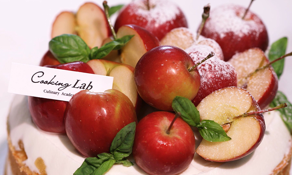 3. 완성된 케이크 위에 미니 사과와 바질, 슈가 파우더를 올려 장식합니다.