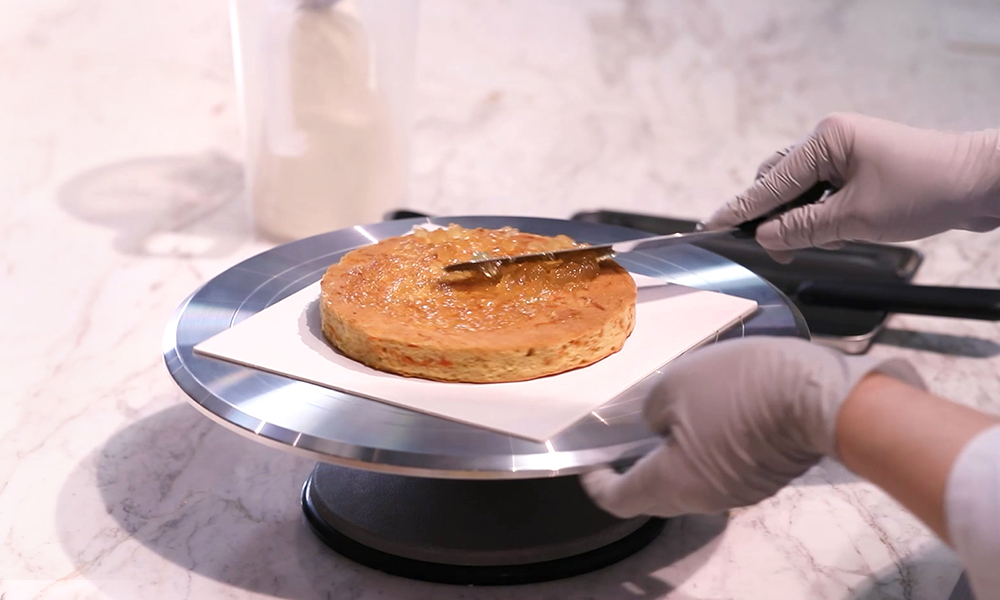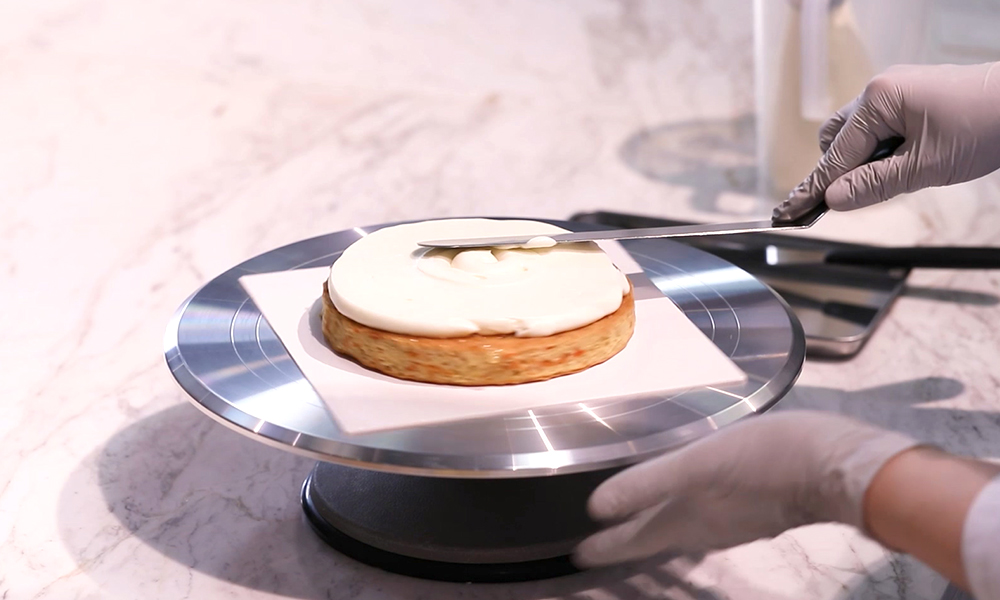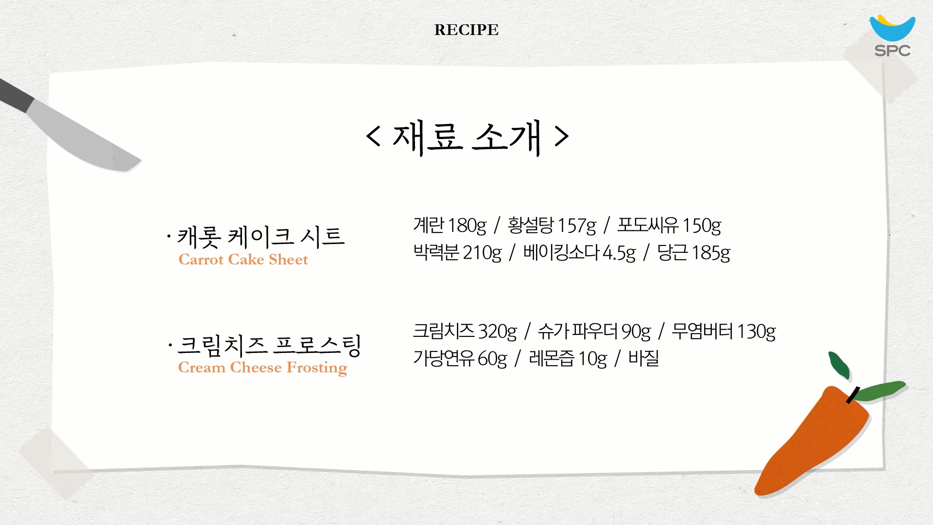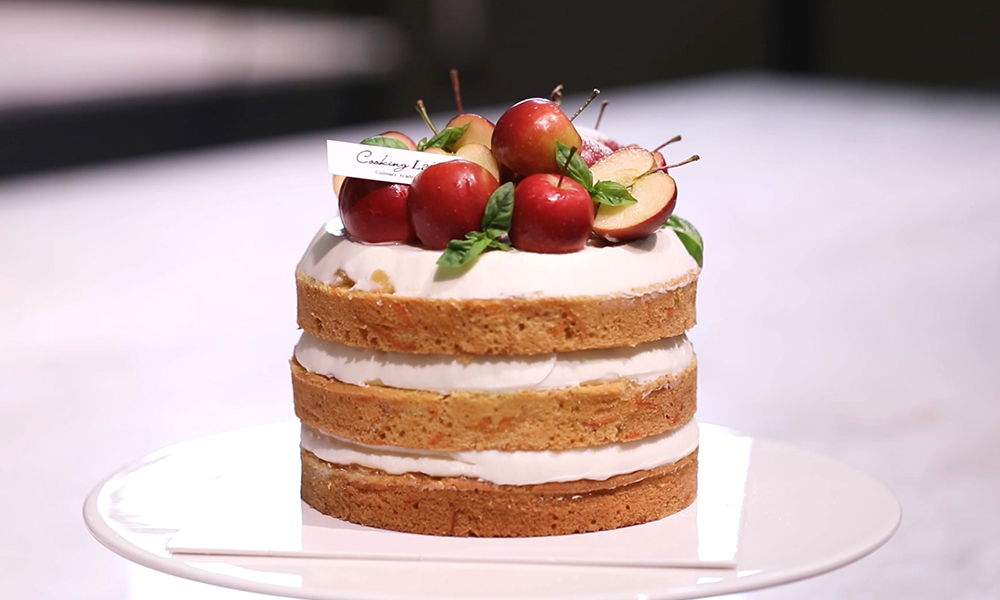 오늘은 국내산 당근을 사용해서 만든 시트와 크림치즈 프로스팅을 더한 기본 케이크에 특별히 파리바게뜨의 ‘레피시에(LEPICIE) 사과잼’을 사용해 달콤함을 듬뿍 더했는데요. 애플 캐롯 케이크 위에는 미니 사과와 바질을 곁들여 눈을 사로잡는 비주얼을 완성합니다.