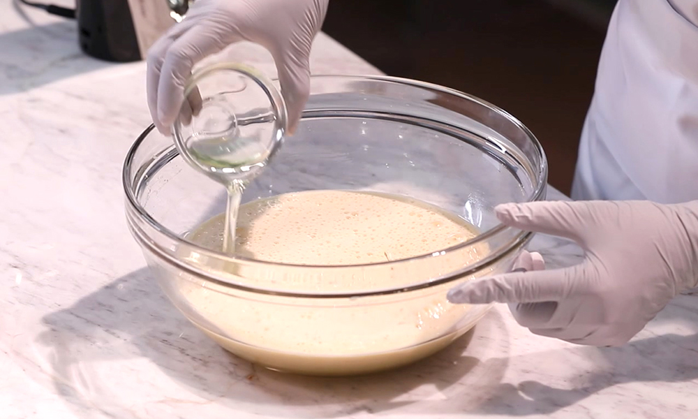 3. 설탕과 혼합된 달걀 물에 포도씨유를 넣고 가볍게 휘핑합니다. 이때, 포도씨유는 두 번에 나누어 혼합하는 것이 좋습니다.