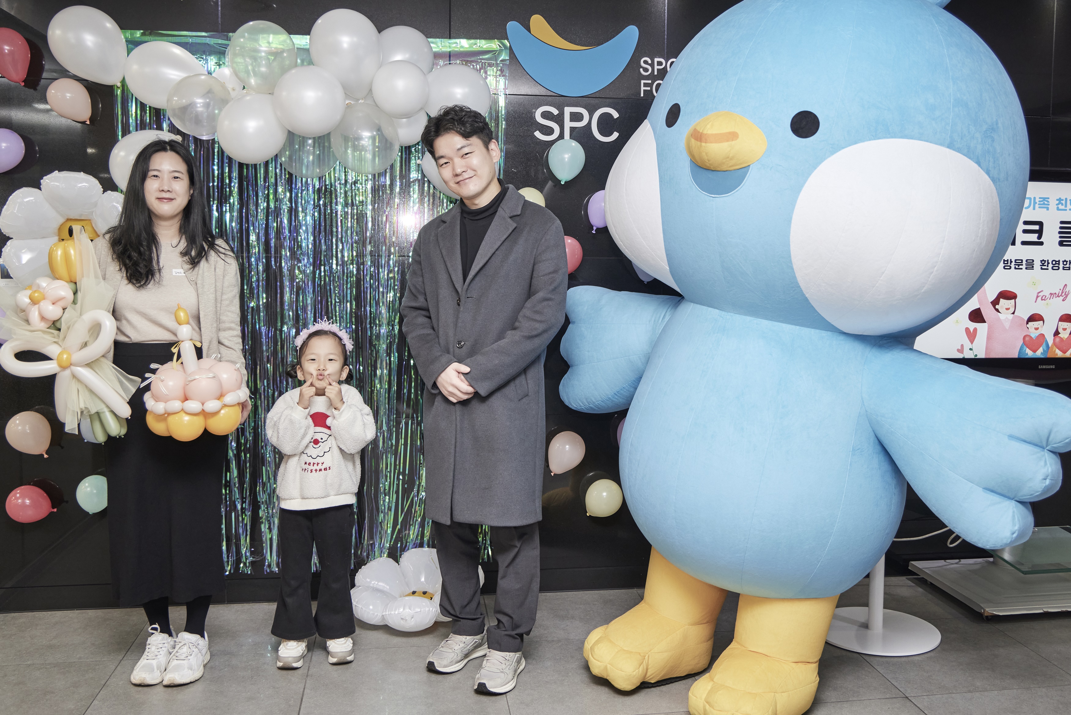 SPC 미래창조원 4층 식품과학대학 로비에 마련된 포토존에서 풍선 부케를 들고 사진을 찍는 가족들
