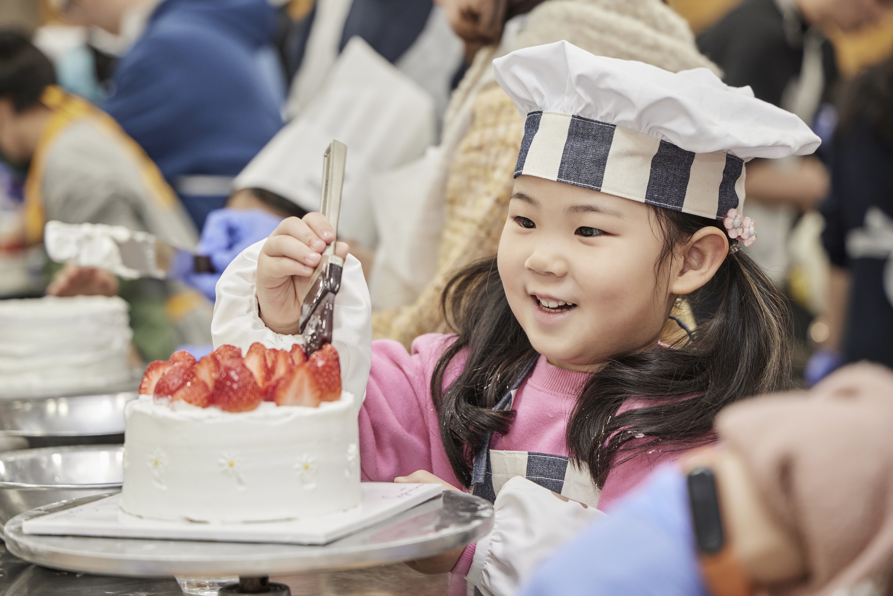 오븐에서 쿠키가 맛있게 구워지는 동안 ‘딸기 생크림 케이크 만들기’가 이어졌는데요. 생크림 케이크 만들기의 핵심이라 할 수 있는 ‘아이싱’에 대해 배우는 시간이었습니다. 상당한 집중력을 필요로 하는 작업이라 장난기 넘치던 아이들의 표정에도 사뭇 진지함이 보이네요.