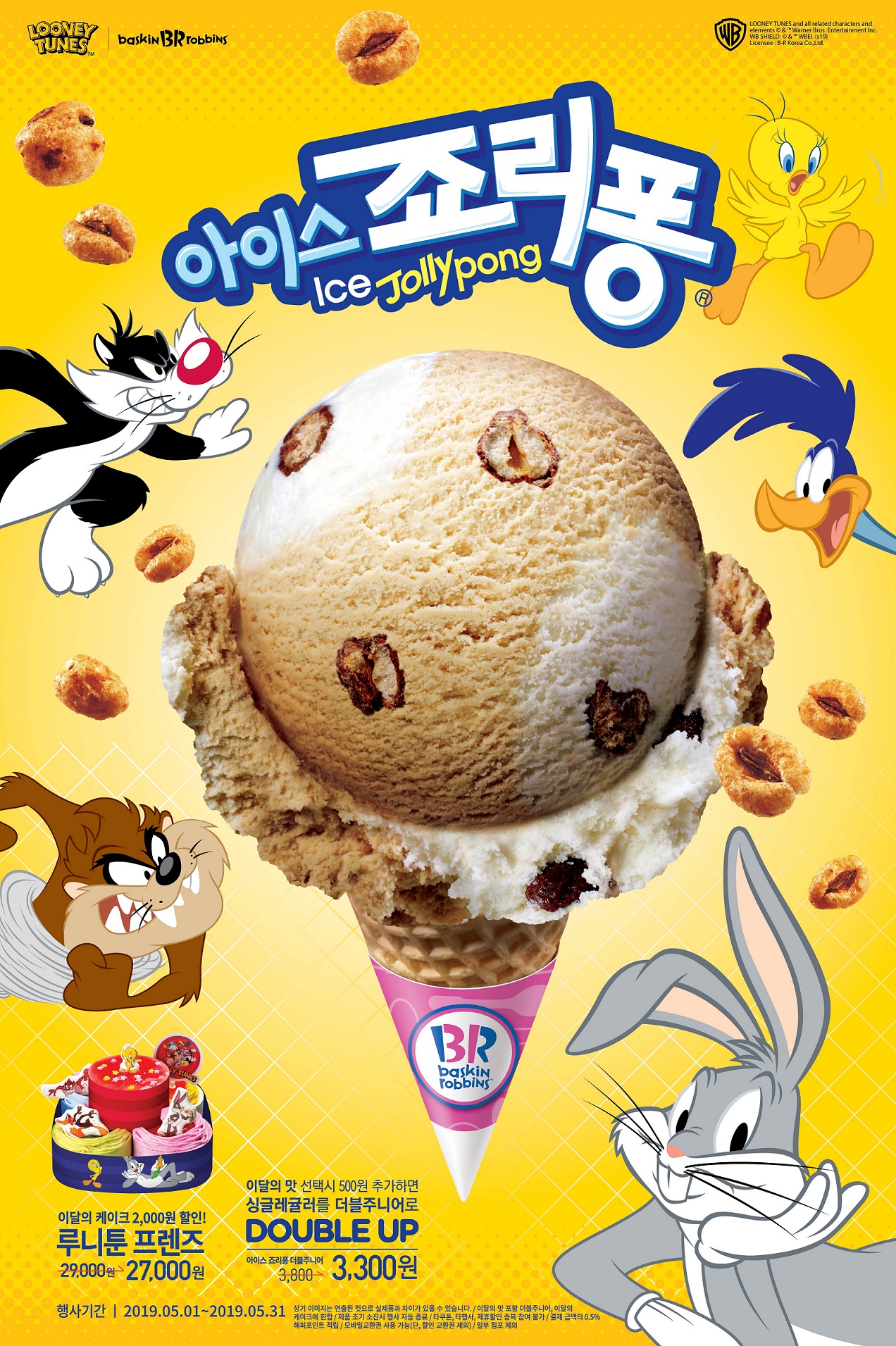 배스킨라빈스는 가정의 달 5월을 맞이해 아이스크림 케이크 신제품도 출시한다. 인기 애니메이션 ‘루니툰(Looney Tunes)’ 컨셉을 적용한 ‘루니툰 프렌즈’ 케이크는 홀로그램 루니툰 로고와 트위티, 벅스버니 등 캐릭터 초콜릿을 올린 2단 케이크로, 머스크메론향, 블루베리팝핑, 베리베리스트로베리, 체리쥬빌레, 뉴욕치즈케이크 총 5가지 맛을 담았다. 이외에도, 크라운제과의 ‘카라멜콘땅콩’을 활용한 ‘아이스 카라멜콘땅콩’ 아이스크림과 ‘아이스 마카롱 카라멜콘땅콩’ 등도 추후 선보일 예정이다.