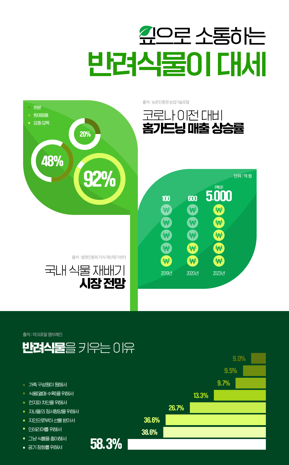 식물 키우기가 트렌디한 여가 활동으로 자리 잡으면서 홈가드닝 시장은 매년 성장세입니다. 농촌진흥청이 발표한 자료에 따르면, 코로나 이전 대비 홈가드닝 관련 제품의 매출이 묘종·묘목 92%, 화분 48%, 원예용품은 20%가 상승했는데요. 꽃, 채소 등을 가정에서 키울 수 있는 식물재배기의 시장 규모도 2019년 100억 원에서 2020년 600억 원으로 확대되며, 올해는 무려 5천억 원까지 증가할 것으로 전망됩니다. 반려식물을 향한 관심이 커지자, 정부에서는 지난 5월 ‘반려식물산업 육성 및 지원 조례’를 본회의에서 통과시켜 반려식물산업의 성장 기반을 마련하고, 지원 사업 확대에 힘을 실었습니다.
