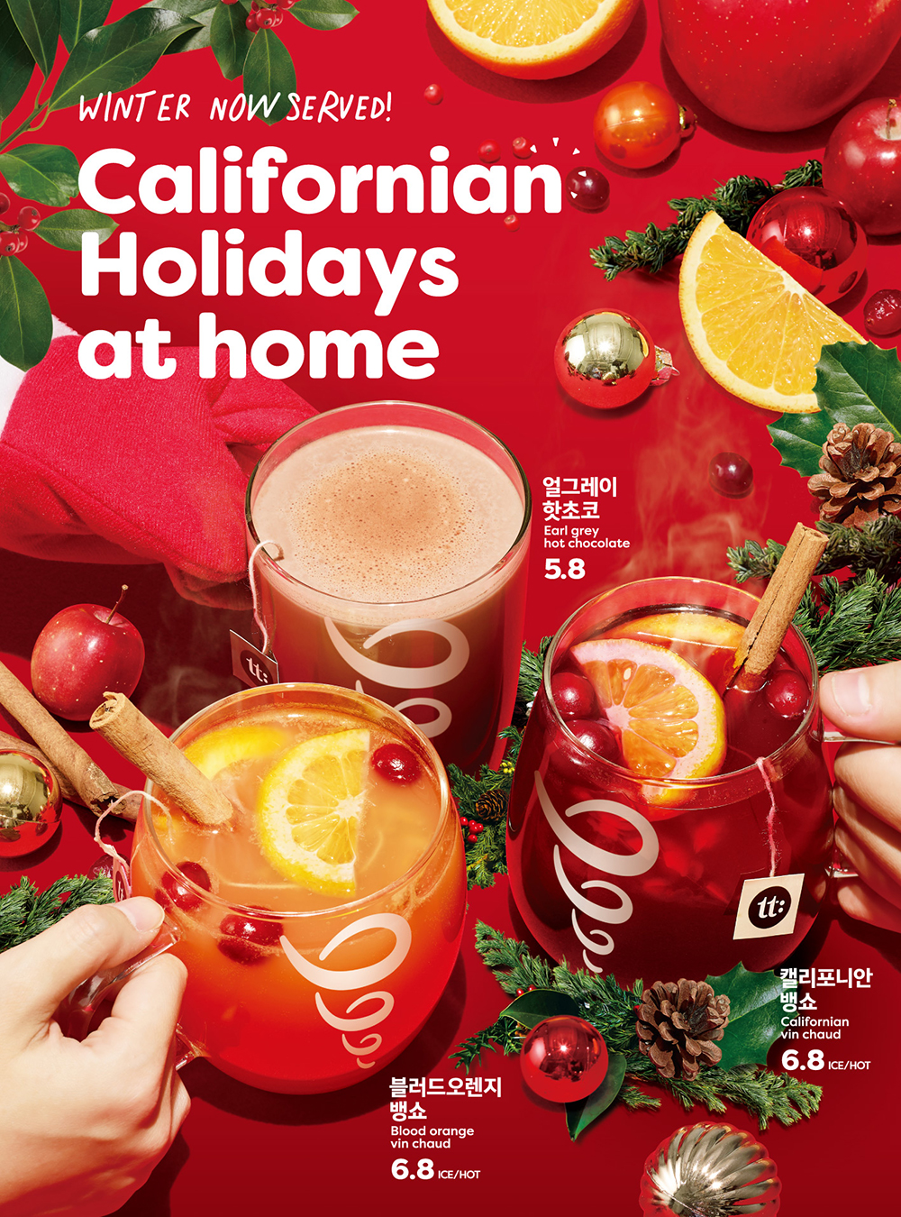 신제품 4종은 △은은한 과일향이 특징인 윈터프룻번치 티와 이국적인 향의 히비스커스 티에 신선한 생과일 토핑, 시나몬 향을 더한 ‘캘리포니안 뱅쇼(HOT/ICED 6,800원)’ △ 신선한 착즙 오렌지주스와 윈터프룻번치 티에 생과일 토핑과 시나몬향을 더한 ‘블러드오렌지 뱅쇼(HOT/ICED 6,800원)’ △얼그레이 티의 향이 달콤한 핫 초코에 더해져 조화를 이루는 ‘얼그레이 핫초코(HOT 5,800원)’ △ 코코넛밀크를 활용한 스무디에 상큼한 딸기 과육을 넣어 식감을 살린 ‘딸기코코넛 스무디(ICED 4,900원~7,900원)’ 등 4종이다.