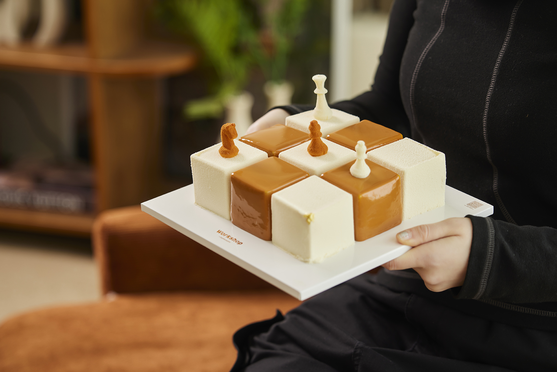 금빛 격자무늬의 체스보드✨를 모티브로 한 아이스크림 케이크! 큐브 모양의 아이스크림 조각과 체스말 모양의 초콜릿을 더해 실제 체스보드를 연상시키는 화려한 비주얼이 특징이에요. 해당 제품은 ‘워크샵 by 배스킨라빈스’에서만 한정 판매된다고 하니, 놓치지 마세요!