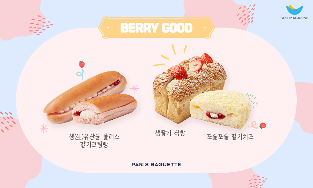 파리바게뜨에서는 매년 딸기 페어를 통해 제철 딸기를 활용한 시즌 한정 제품을 선보이는데요. 올해에는 ‘Very Good’이라는 의미를 중의적으로 담아낸 ‘BERRY GOOD’을 테마로 딸기 고유의 맛을 극대화한 신제품들을 출시했습니다. 먼저, ‘생딸기 식빵’은 먹음직스러운 비주얼이 시선을 사로잡는데요. 겉은 바삭하고 속은 촉촉한 식빵 안에 부드러운 생크림과 진한 딸기 필링, 생딸기를 가득 채웠습니다.