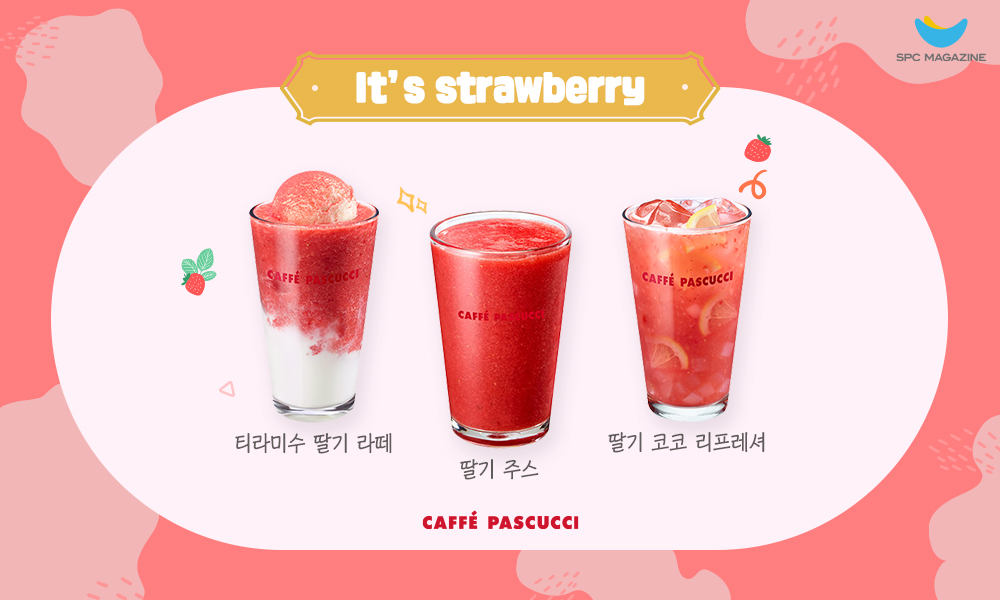 SPC그룹이 운영하는 커피전문점 파스쿠찌에서도 제철 딸기를 활용한 신제품을 무려 11종이나 출시했는데요. ‘It’s Strawberry(내 공간이 딸기로 가득해지는 순간)’라는 콘셉트로 지금까지 맛보지 못했던 새로운 메뉴들을 선보입니다. 특히 제주 감귤, 귀리 우유, 요거트 젤라또 등 딸기와 뛰어난 궁합을 자랑하는 재료들을 활용했는데요. 음료는 물론, 케이크까지 다양한 메뉴가 준비되어 있습니다.