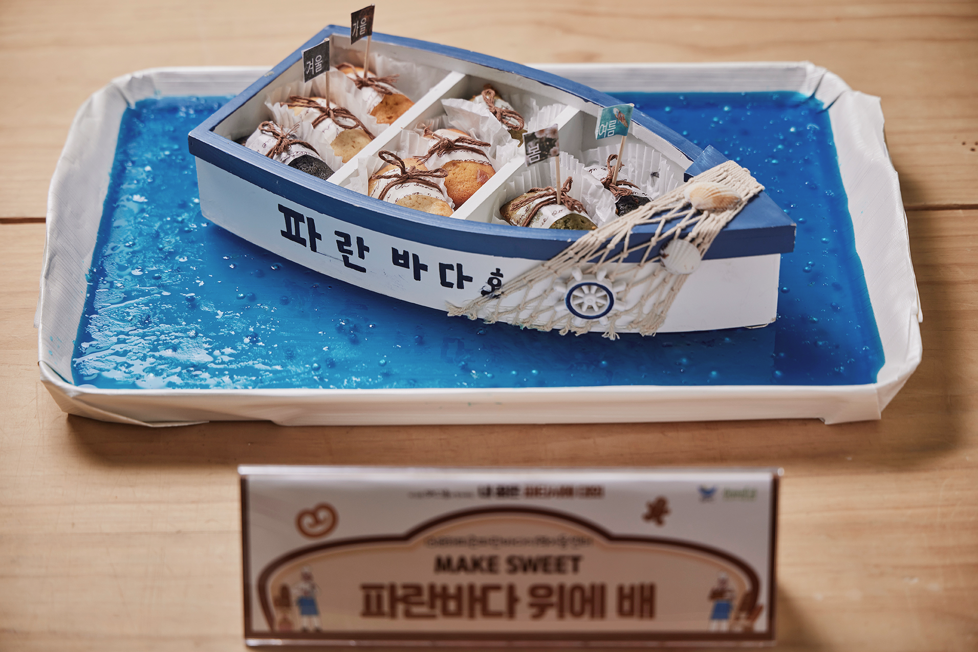 대상을 수상한 ‘메이크 스위트’팀의 ‘파란바다 위에 배’는 배가 피낭시에를 가득 싣고 지역 명소인 안목 해변, 경포 해변을 상징하는 바다 위를 떠 있는 모습을 표현한 작품입니다.