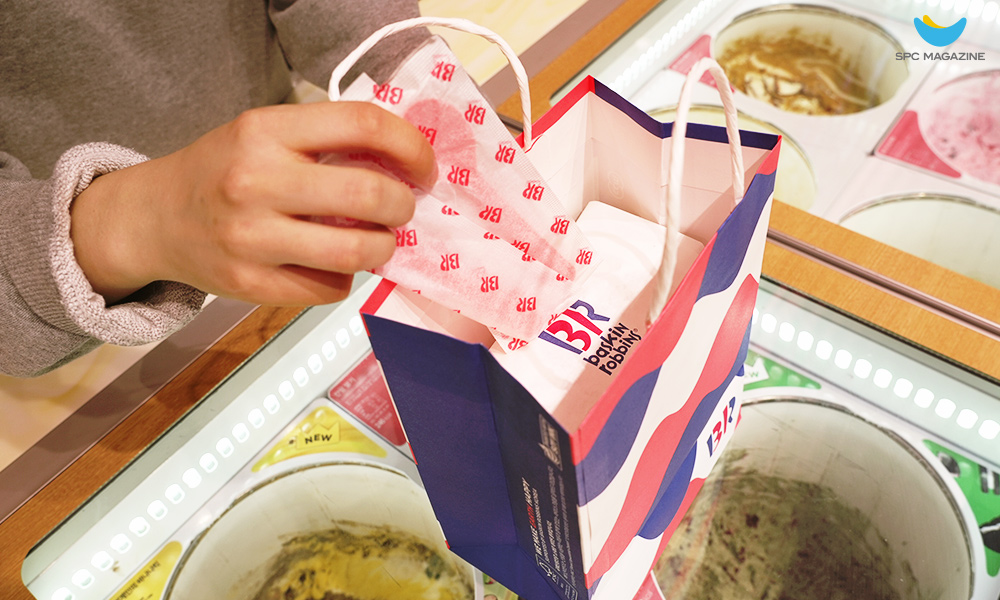 배스킨라빈스는 친환경을 위한 한 스푼의 기적을 실천하고 있는데요. 배달 및 포장에 사용되는 핑크스푼의 포장지를 비닐에서 종이로 전격 변경했습니다. 가장 많이 사용되는 부분인 만큼 친환경 패키징을 적용해 제공하기로 결정한 것입니다. 지난 7월 15일부터는 핑크스푼 유상제공 정책도 시행하고 있는데요. 제품 사이즈별로 핑크스푼 무상제공 수량을 제한하고, 추가 요청 시 50원에 유상 판매하고 있습니다. 맛보기 스푼 역시 우드스푼으로 교체했는데요. 이제는 31가지의 다양한 아이스크림을 핑크색 맛보기 스푼이 아닌 우드스틱으로 맛볼 수 있습니다. 2021년 이후부터는 쇼핑백 패키징을 친환경 재질로 변경해 재활용률을 증대시키고 있는데요. FSC(국제산림협회)인증 종이를 사용하고 SOY INK(콩기름 잉크)로 인쇄한 봉투를 전 매장에 동일하게 적용하고 있습니다.