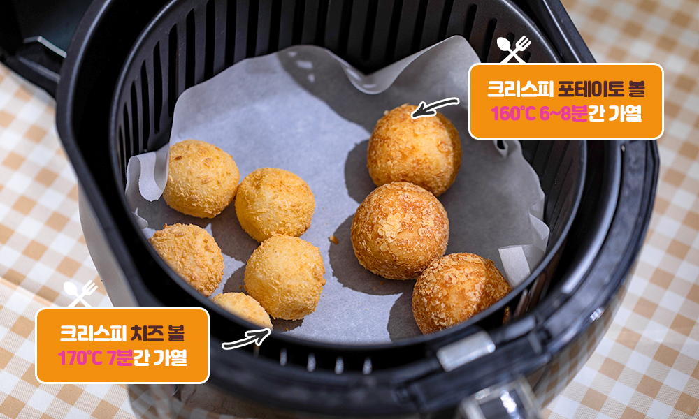 Step 1. 에어프라이어에 크리스피 볼을 구워주세요. 치즈볼은 160℃에 6~8분, 포테이토볼은 170℃에 7분간 돌리면 맛있게 완성됩니다.