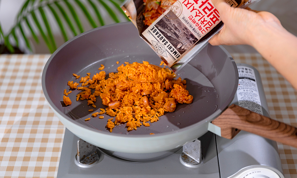 Step 2. ‘김치 소시지 필라프’를 프라이팬에 볶은 후 접시에 담아주세요.