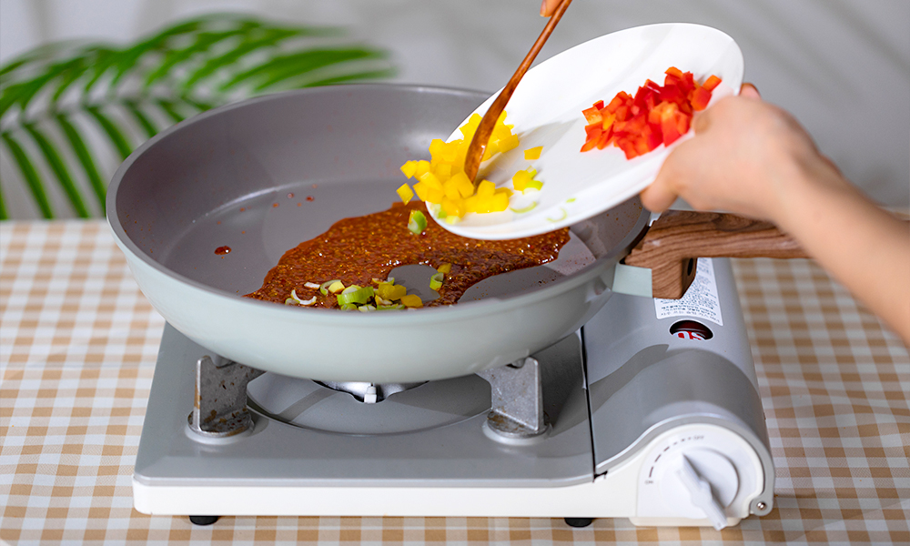 Step 2. 프라이팬에 소스를 붓고 잘게 썬 채소를 볶아주세요.