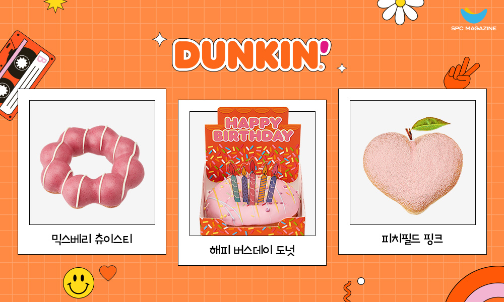 업그레이드된 사이즈로 돌아온 ‘해피 버스데이 도넛’은 알록달록 팝핑캔디와 폭죽을 연상시키는 스프링클로 화려함을 더했는데요. ‘해피 버스데이 도넛’의 존재감 뿜뿜한 비주얼로 축하하는 자리를 더욱 빛내 보세요. ‘피치핑크 필드’는 탐스러운 복숭아 모양의 도넛에 향기로운 복숭아 과즙과 과육을 가득 채워 복숭아 본연의 맛을 그대로 느낄 수 있는데요. 하트를 연상시키는 복숭아는 사랑스러운 비주얼을 완성시켜 줍니다.