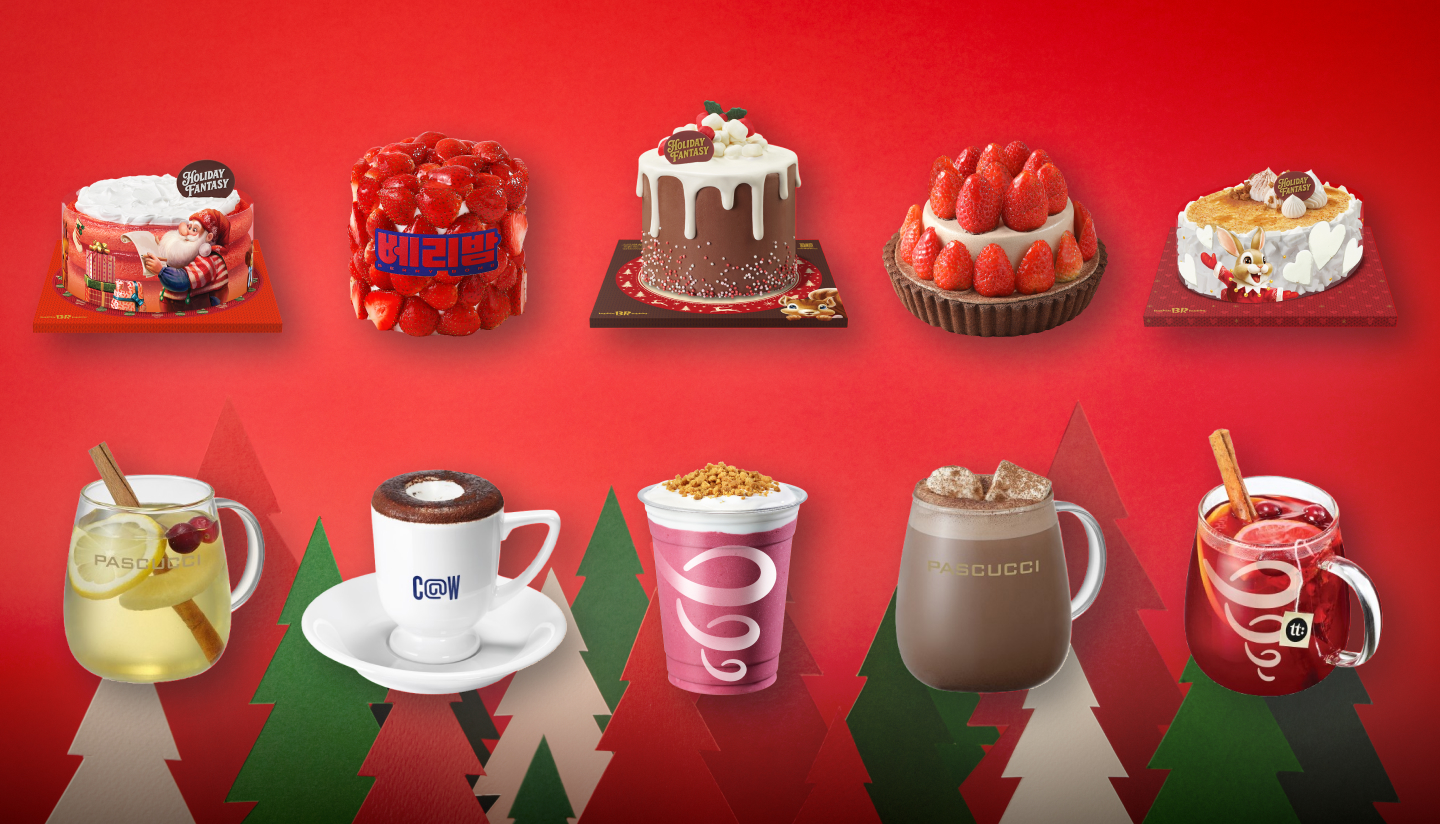 올 겨울, 어떤 조합으로 크리스마스 테이블을 채워보시겠어요? 파리바게뜨, 파스쿠찌, 던킨, 커피앳웍스, 배스킨라빈스 등 다양한 브랜드의 홀리데이 시즌 메뉴와 함께 올 한 해의 마지막 페이지를 달콤하고 따뜻하게 장식해 보시길 바랍니다.
