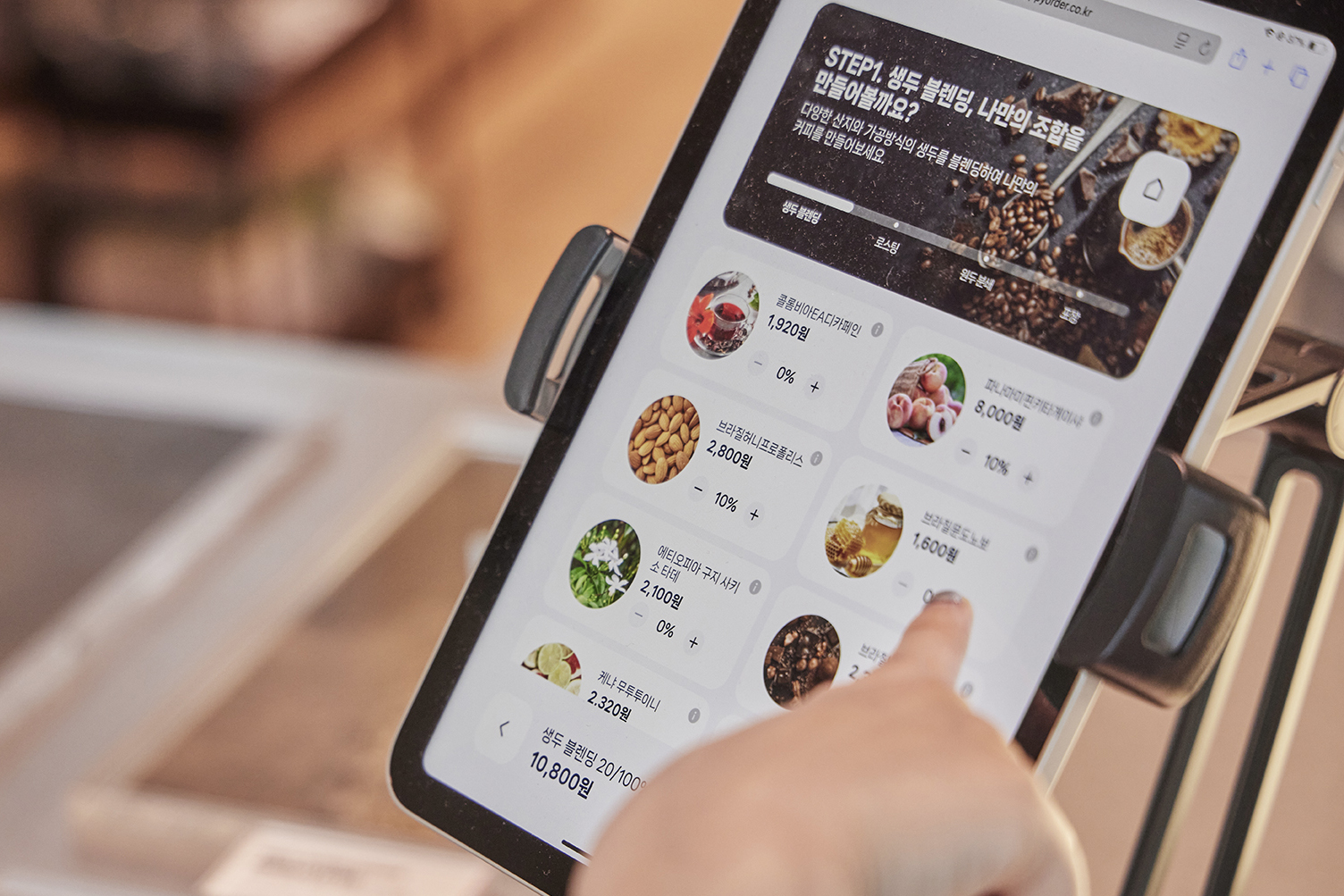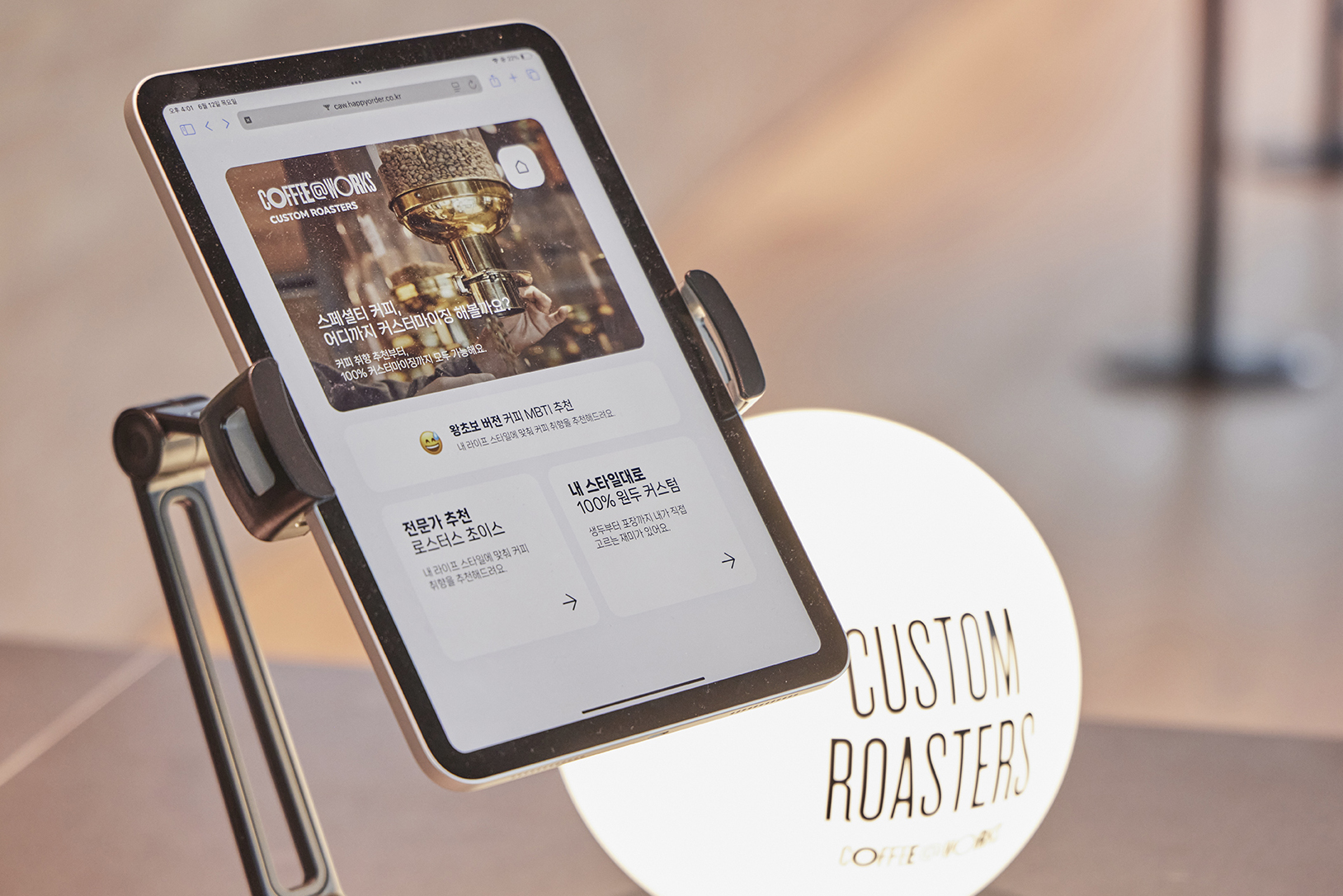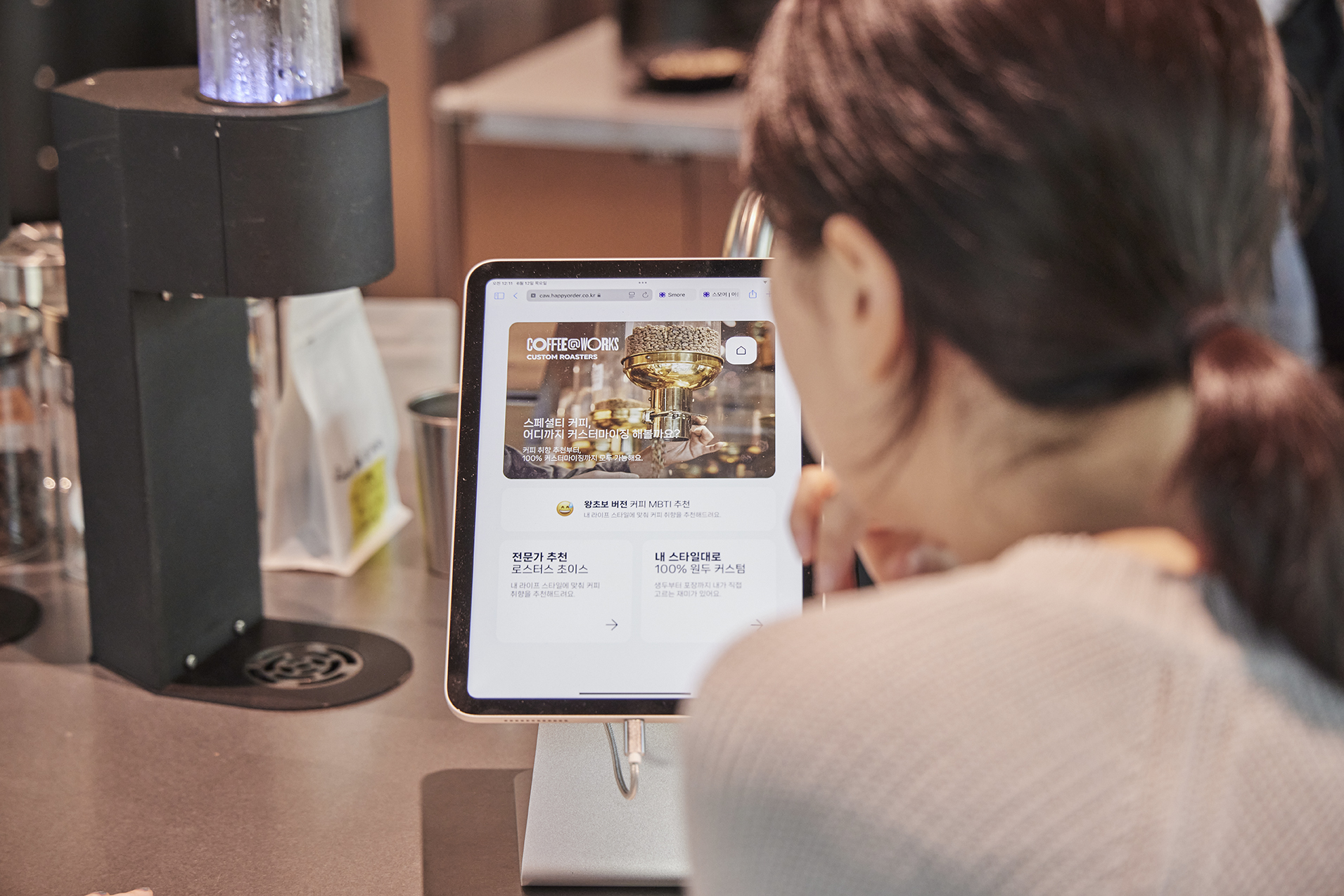 커스텀 로스팅 과정은 다음과 같은 단계로 진행됩니다. 매장 내 ‘커스텀 로스터리 존’에 비치된 태블릿을 통해 생두 선택부터 로스팅 포인트, 포장 방식까지 섬세하게 설정할 수 있죠. 다양한 산지와 가공 방식의 생두를 취향에 맞게 블렌딩해, 세상에 하나뿐인 나만의 커피를 완성해보세요!