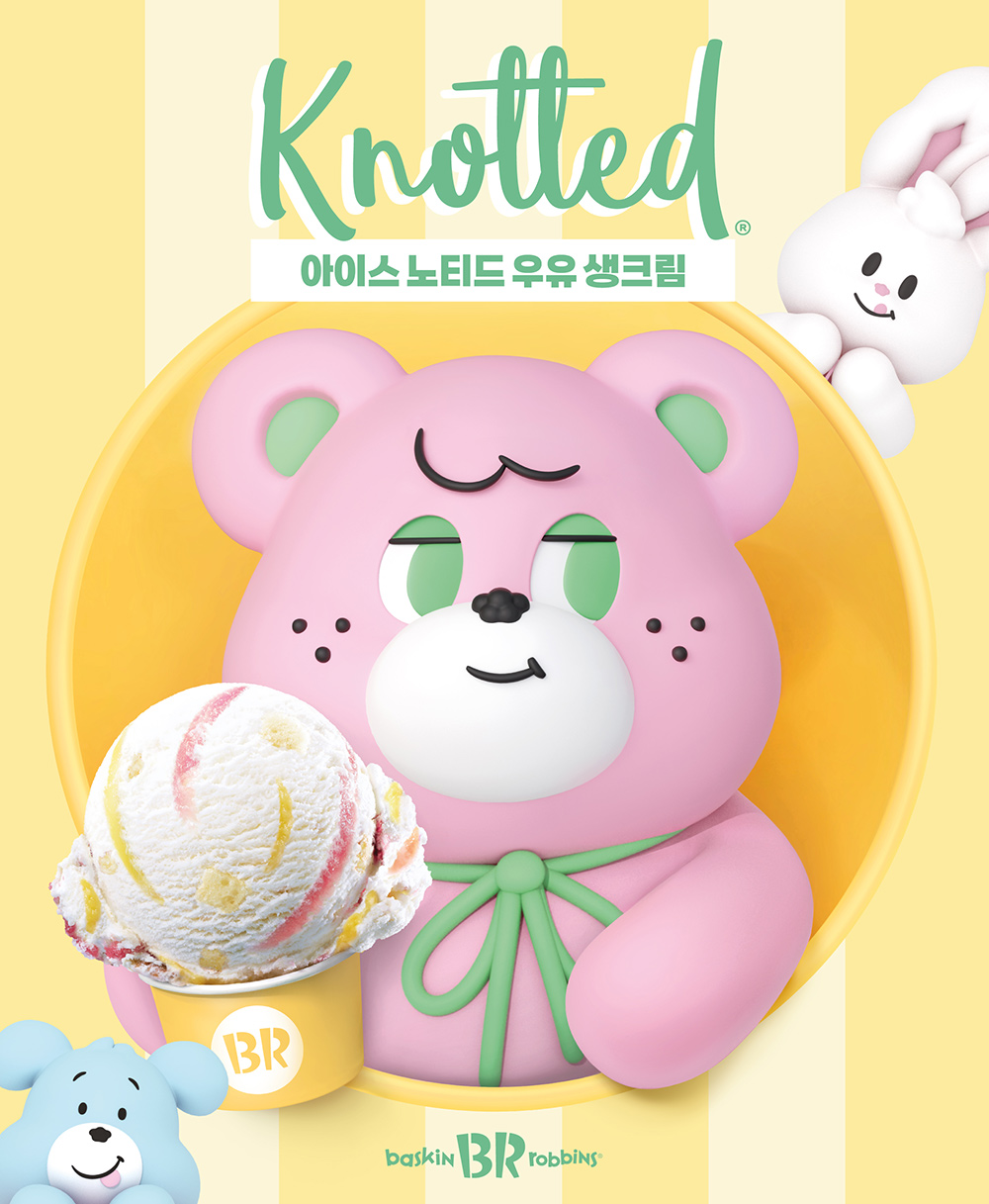 ‘배스킨라빈스’는 지난달 ‘노티드’와 협업해 ‘아이스 노티드 우유 생크림’을 선보였습니다. 8월 ‘이달의 맛’이었던 ‘아이스 노티드 우유 생크림’은 ‘노티드’를 대표하는 제품 ‘우유 생크림 도넛’을 시원한 아이스크림으로 구현한 플레이버인데요. 우유 풍미가 가득한 ‘노티드’ 도넛의 크림을 부드러운 우유 생크림 아이스크림으로 표현하고, ‘배스킨라빈스’의 시그니처 컬러인 분홍색과 ‘노티드’의 시그니처 컬러인 노란색의 커스터드 리본을 둘러 포인트를 주었습니다. 콜라보 기간에는 ‘노티드 스마일 크림 버니’와 ‘노티드 우유 생크림 맘모슈’를 함께 출시해 ‘우유 생크림 도넛’ 덕후들로 하여금 고르는 재미를 더했습니다.
