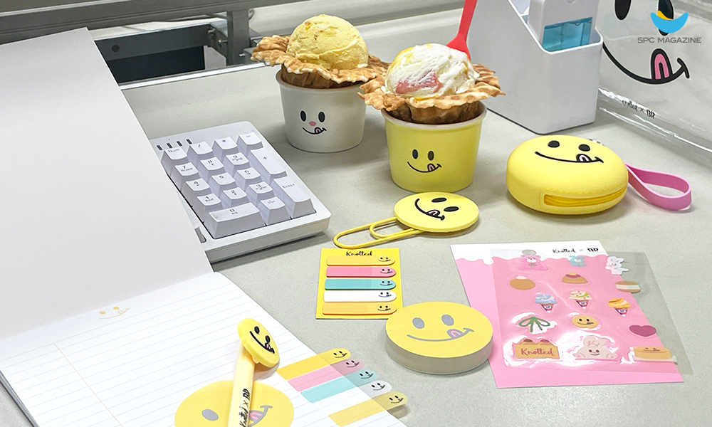 콜라보 기간에는 ‘노티드’의 시그니처 스마일 캐릭터가 담긴 굿즈도 만나볼 수 있었습니다. 학교와 직장 생활 중 꼭 필요한 아이템들로 구성된 ‘노티드 문구세트’는 푸짐한 구성으로 인기를 끌었는데요. 낱장으로 뜯어서 사용할 수 있는 A5 사이즈의 노트와 접착식 떡메모지, 젤펜, 빅클립, 인덱스, 그리고 구성품을 모두 넣을 만큼 넉넉한 사이즈의 투명 파우치까지 알찬 구성이 특징입니다.