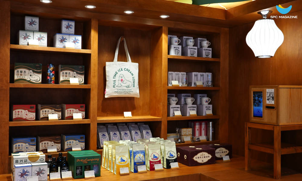 ‘프릳츠’의 물개 캐릭터가 새겨진 에코 숄더백도 함께 만나볼 수 있습니다. 한정판으로 출시된 ‘프릳츠 에코 숄더백’은 캔버스 소재로 제작되어 가볍고, 편하게 사용할 수 있는데요. 가방 내부에 포켓을 더해 실용성과 디테일을 살린 것이 특징입니다. 콜라보 제품 외에도 1층 굿즈 존에서는 ‘프릳츠’의 오리지널 원두와 캡슐 커피, 머그잔 등 다양한 상품을 만날 수 있습니다.