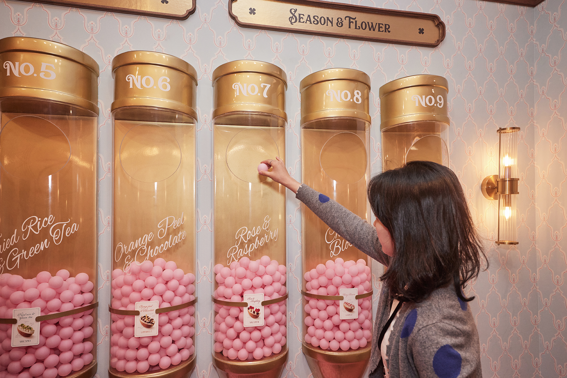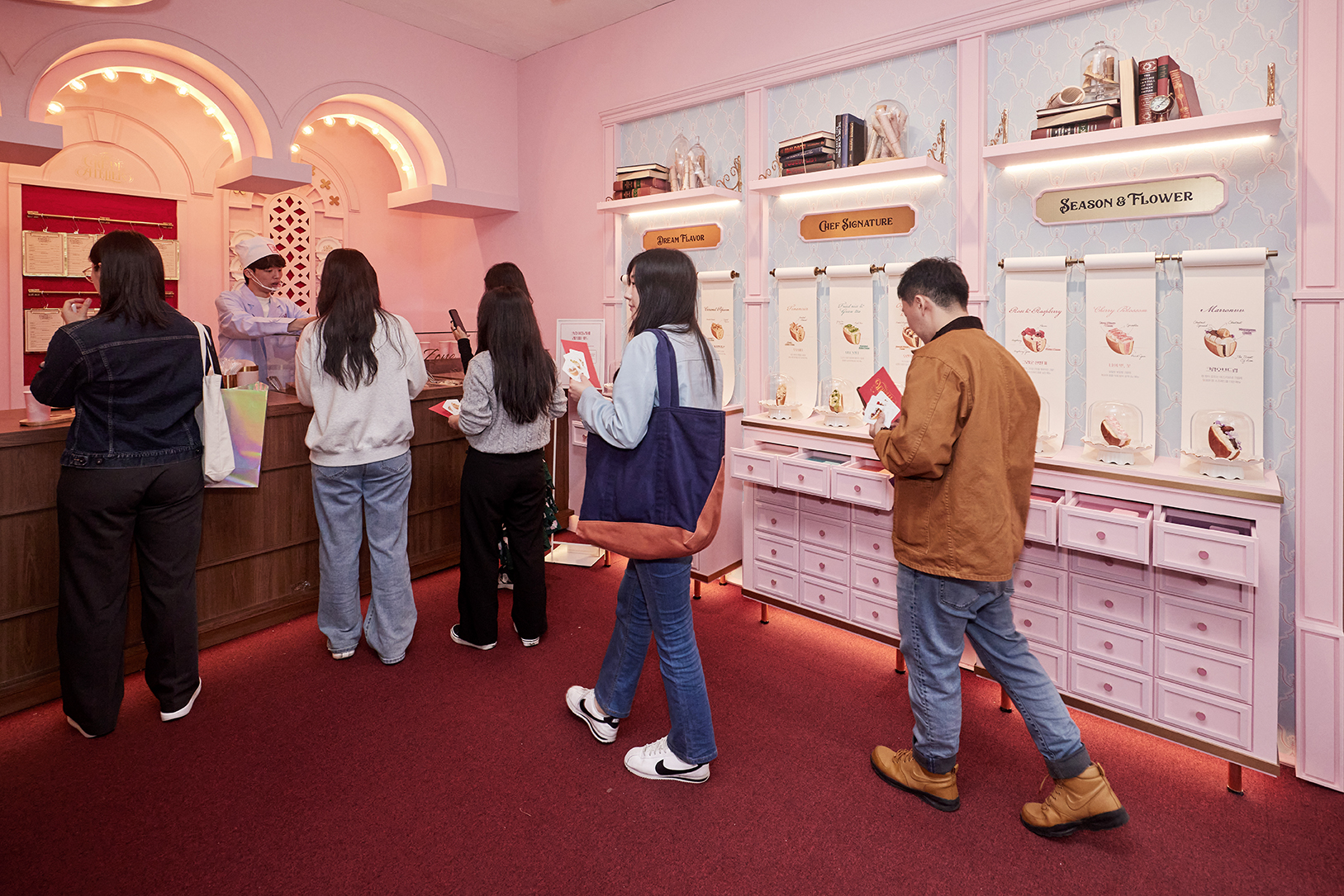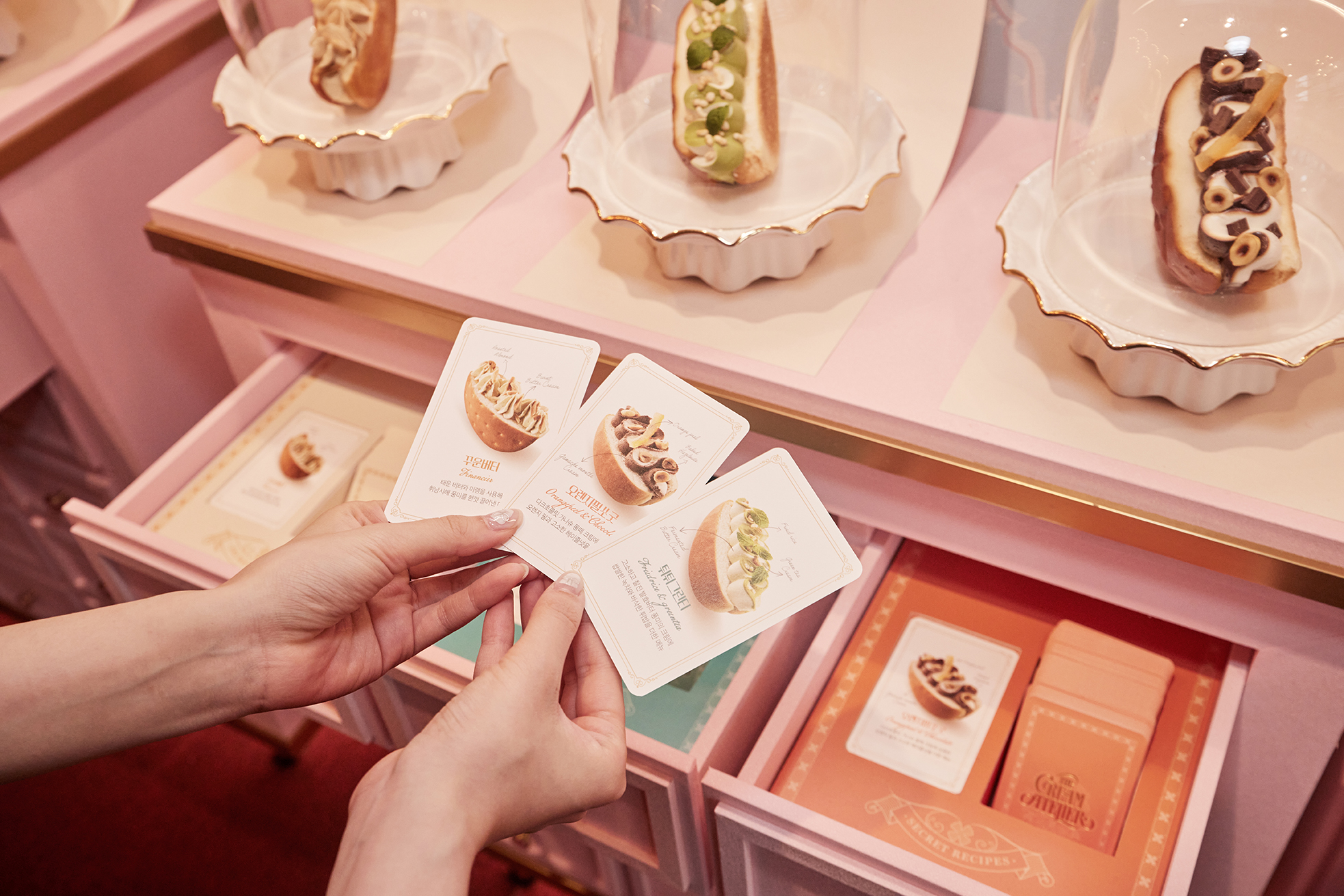 히스토리존 다음 단계! ‘맛보기존’으로 가볼까요? ‍ 이번 팝업스토어에서 가장 인기를 끌었던 곳이기도 한데요. 크림만을 연구한 크림 마스터의 비밀 서재를 달콤한 핑크빛 무드로 꾸민 공간에서 크림 마스터가 개발한 9가지의 이색적인 크림을 만날 수 있는 공간입니다. 방문 고객 누구나 맛보기존에 마련된 레시피 카드 세 장을 골라 보여주면 해당 크림을 맛볼 수 있어요.