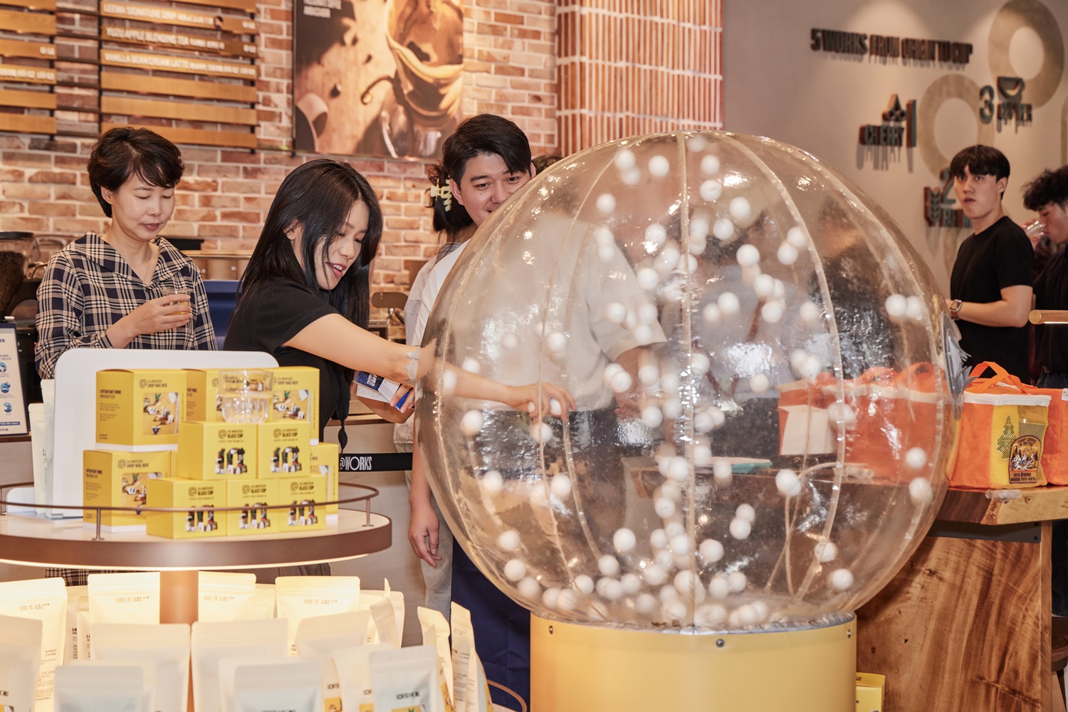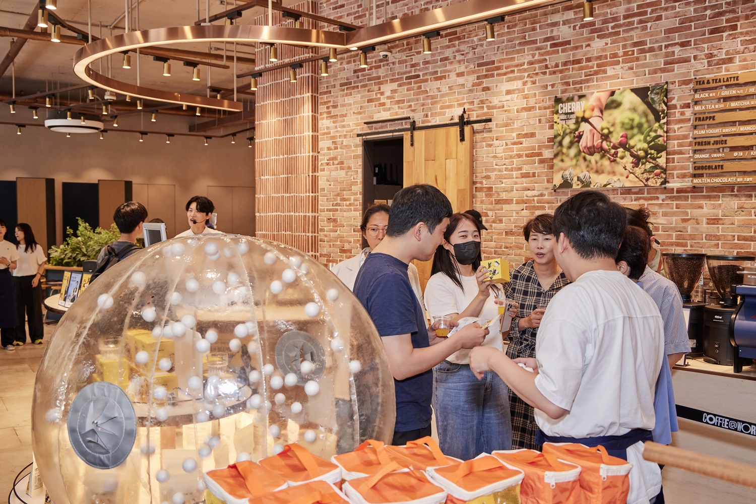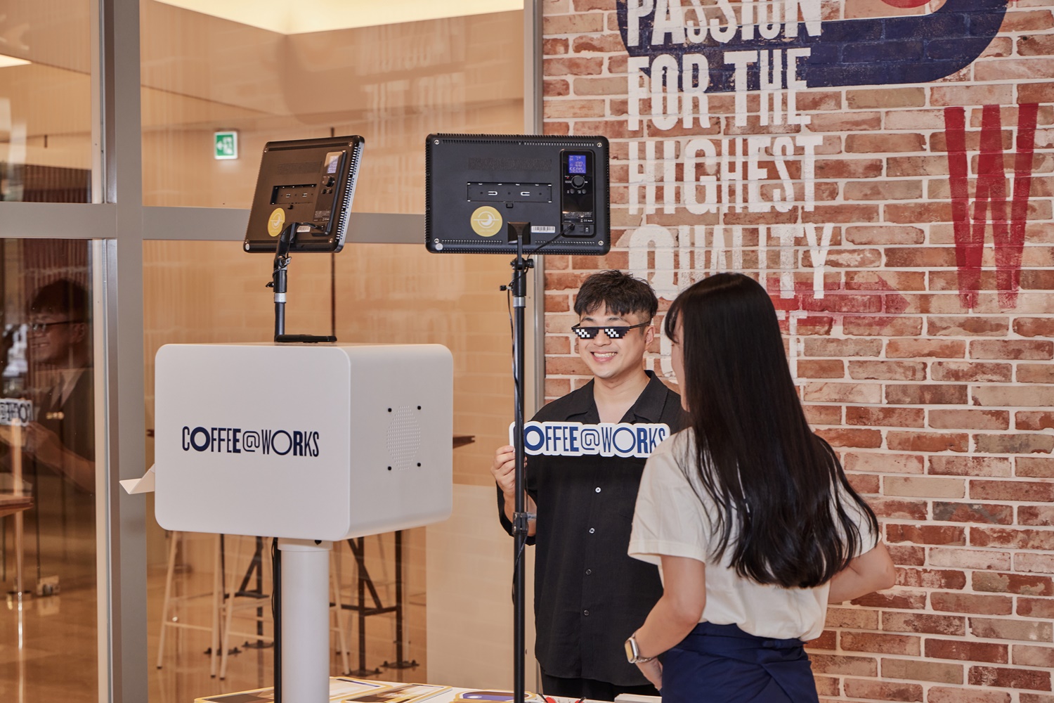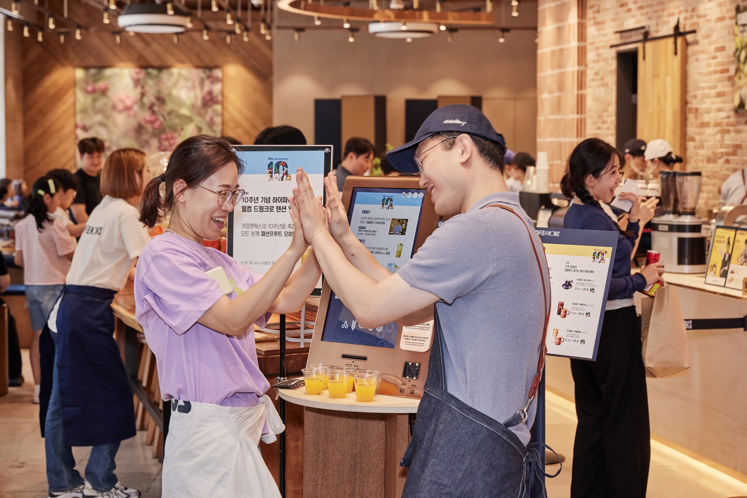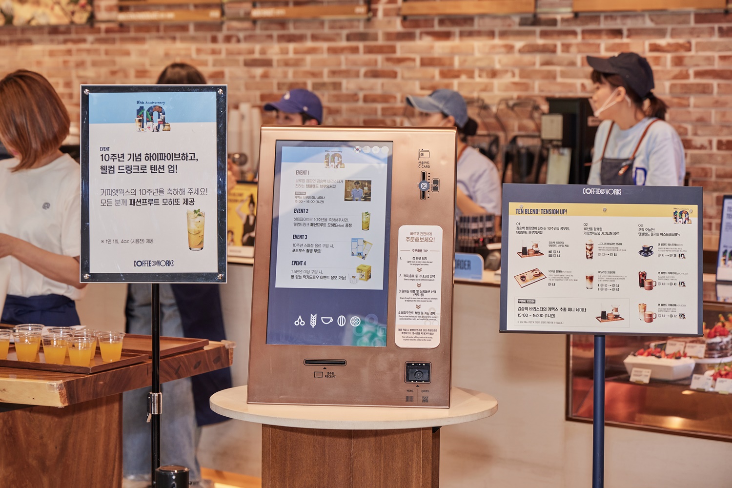 지난 6월 14일 커피앳웍스 이마빌딩광화문점에서는 10주년을 맞아 ‘김승백 초청 게스트 바리스타’ 행사를 진행했습니다. “어서 오세요. 커피앳웍스입니다.” 여느 때와 다름없는 유쾌한 인사가 실내에 울리는 가운데, 색다른 풍경이 눈길을 끌었습니다. 입구에선 커피앳웍스의 바리스타들과 하이파이브로 인사하면 ‘패션프루트 모히토’가 웰컴 드링크로 제공되었습니다. 또 다른 이벤트 프로그램인 ‘럭키드로우’, ‘포토 부스’ 등을 살피는 고객들의 표정엔 설렘과 호기심이 묻어납니다.
