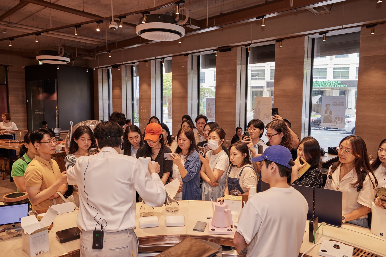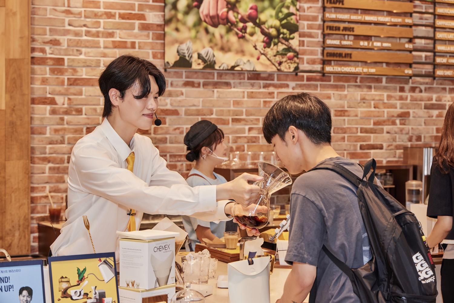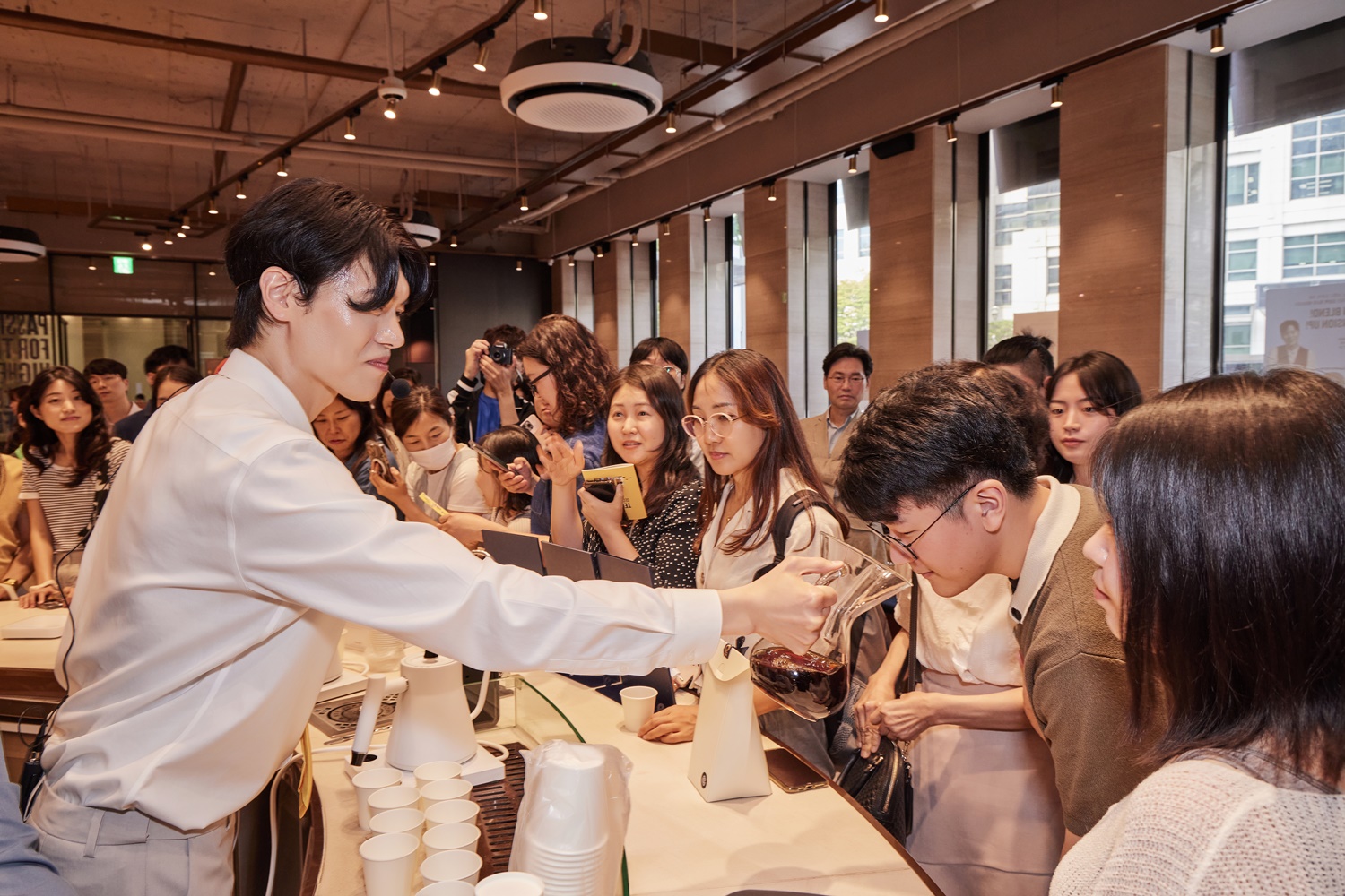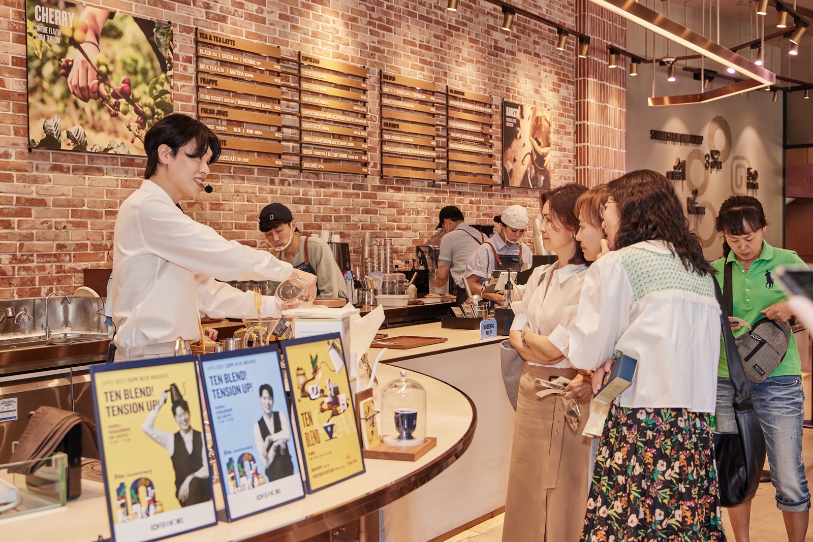 김승백 바리스타는 2022 코리아 브루어스컵 챔피언과 2023 코리아 바리스타 어워드 브루잉 위너 출신으로, 10주년 기념 ‘텐 블렌드’ 레시피 개발에 참여한 인연으로 이날 행사에 함께했습니다. 고객들에게 향을 맡게 하거나 물의 온도, 양 조절 등에 관한 노하우를 전하는 모습이 돋보였죠!